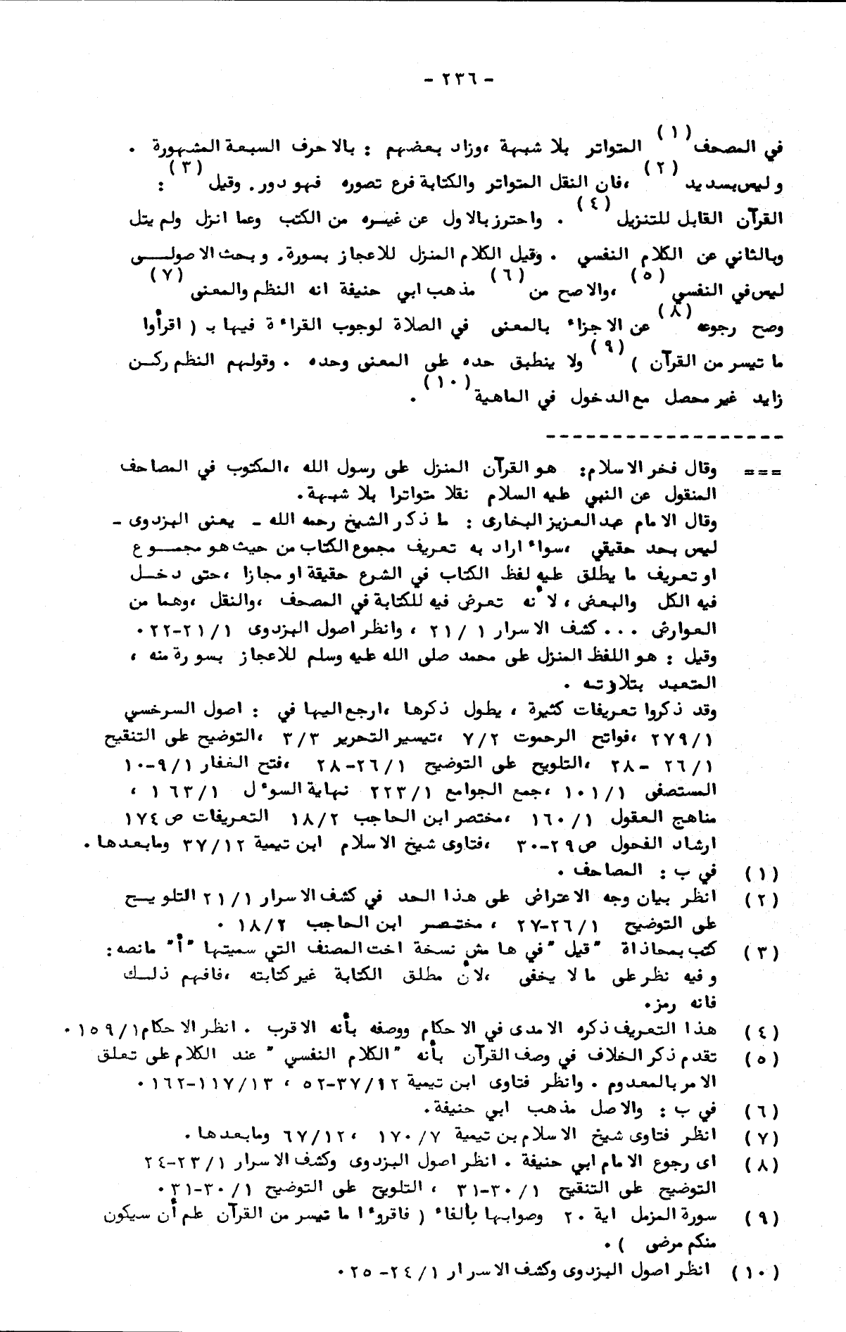 في المصحف المتواتر بلا شبهة، وزاد بعضهم: بالأحرف السبعة المشهورة. وليس بسديد، فإن النقل المتواتر والكتابة فرع تصوره فهو دور. وقيل: القرآن القابل للتنزيل. واحترز بالأول عن غيره من الكتب وعما أنزل ولم يتل وبالثاني عن الكلام النفسي. وقيل: الكلام المنزل للإعجاز بسورة. وبحث الأصولي ليس في النفسي، والأصح من مذهب أبي حنيفة أنه النظم والمعنى وصح رجوعه عن الإجزاء بالمعنى في الصلاة لوجوب القراءة فيها بـ (اقرأوا ما تيسر من القرآن) ولا ينطبق حده على المعنى وحده. وقولهم: النظم ركن زائد غير محصل مع الدخول في الماهية.
