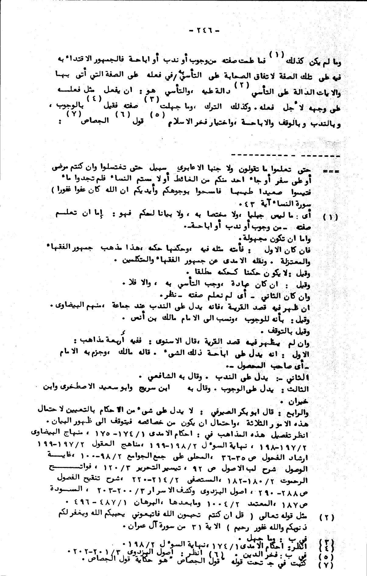 ولما لم يكن كذلك فما علمت صفته من وجوب أو ندب أو إباحة فالجمهور الاقتداء به فيه على تلك الصفة لاتفاق الصحابة على التأسي في فعله على الصفة التي أتى بها والآيات الدالة على التأسي دالة عليه، والتأسي هو أن يفعل مثل فعله على وجهه لأجل فعله. وكذلك الترك، وما جهلت صفته فقيل بالوجوب، وبالندب وبالوقف والإباحة، واختيار فخر الإسلام قول الجصاص:
