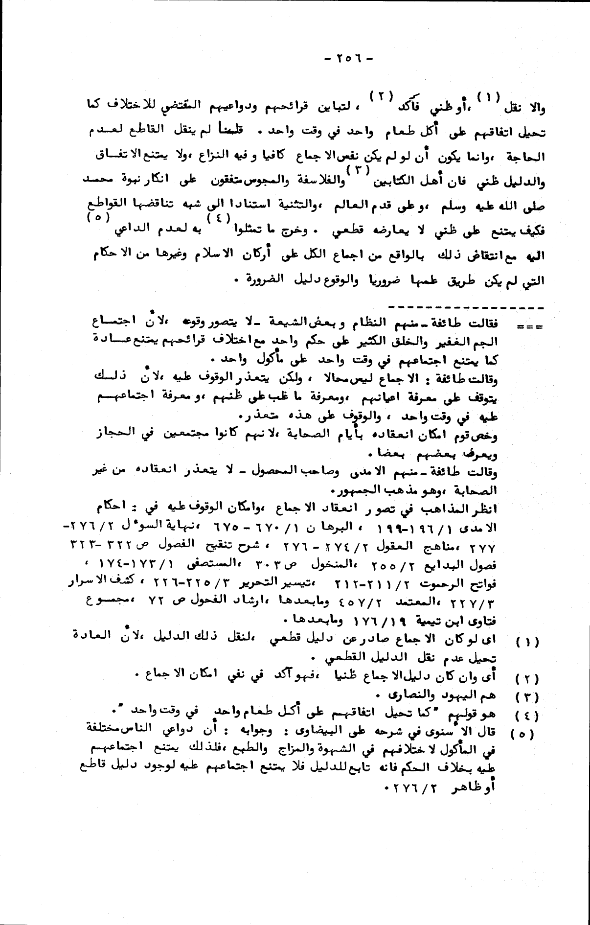 وإلا نقل، أو ظني فآكد، لتباين قرائحهم ودواعيهم المقتضي للاختلاف كما تحيل اتفاقهم على أكل طعام واحد في وقت واحد. قلنا: لم ينقل القاطع لعدم الحاجة، وإنما يكون أن لو لم يكن نفس الإجماع كافيا وفيه النزاع، ولا يمتنع الاتفاق والدليل ظني، فإن أهل الكتابين والفلاسفة والمجوس متفقون على إنكار نبوة محمد صلى الله عليه وسلم، وعلى قدم العالم، والتثنية استنادا إلى شبه تناقضها القواطع، فكيف يمتنع على ظني لا يعارضه قطعي. وخرج ما تمثلوا به لعدم الداعي إليه مع انتقاض ذلك بالواقع من إجماع الكل على أركان الإسلام وغيرها من الأحكام التي لم يكن طريق علمها ضروريا والوقوع دليل الضرورة.
