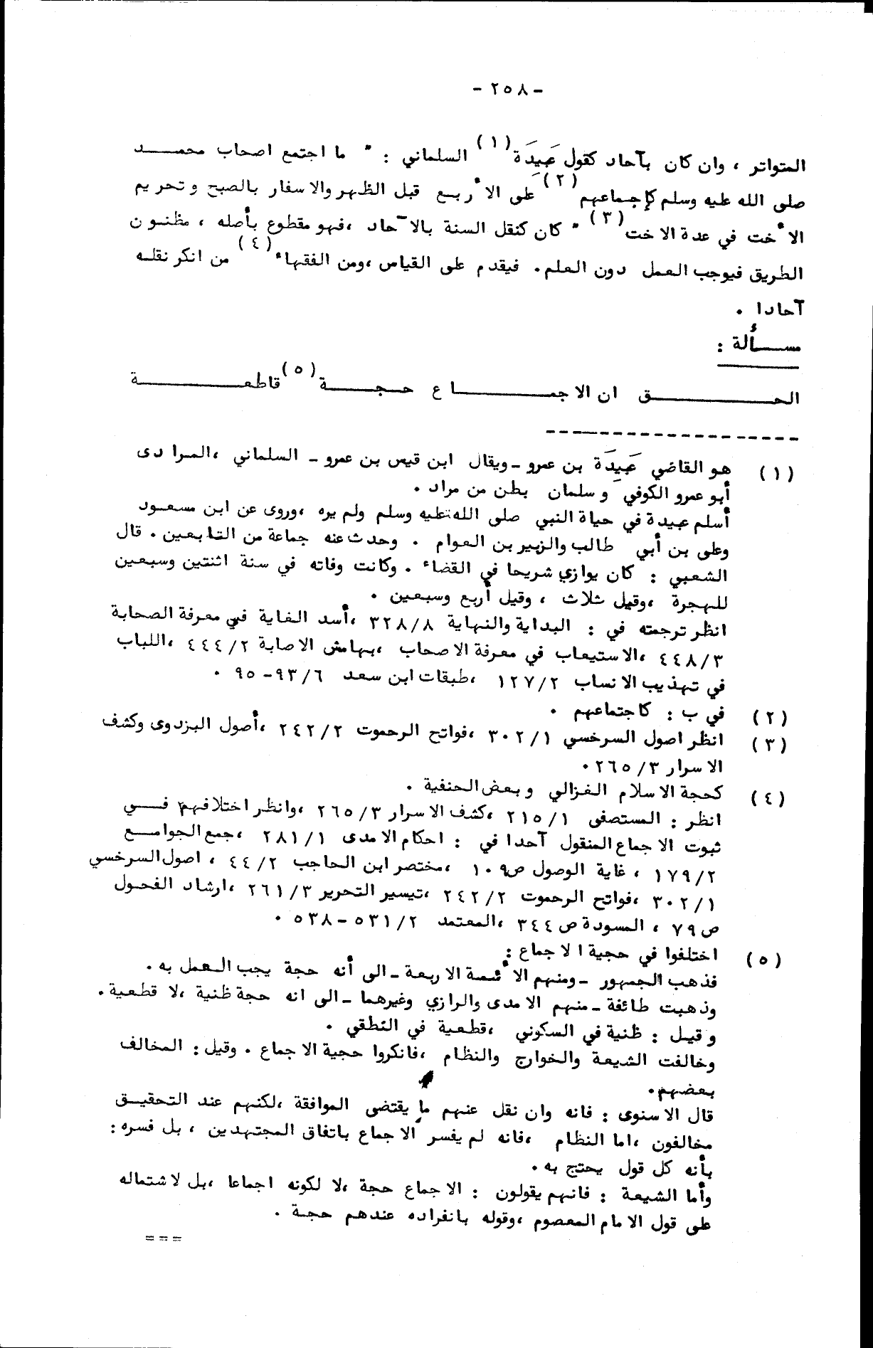 المتواتر، وإن كان بآحاد كقول عبيدة السلماني: ما اجتمع أصحاب محمد صلى الله عليه وسلم كإجماعهم على الأربع قبل الظهر والإسفار بالصبح وتحريم الأخت في عدة الأخت. كان كنقل السنة بالآحاد، فهو مقطوع بأصله، مظنون الطريق فيوجب العمل دون العلم. فيقدم على القياس، ومن الفقهاء من أنكر نقله آحادا.