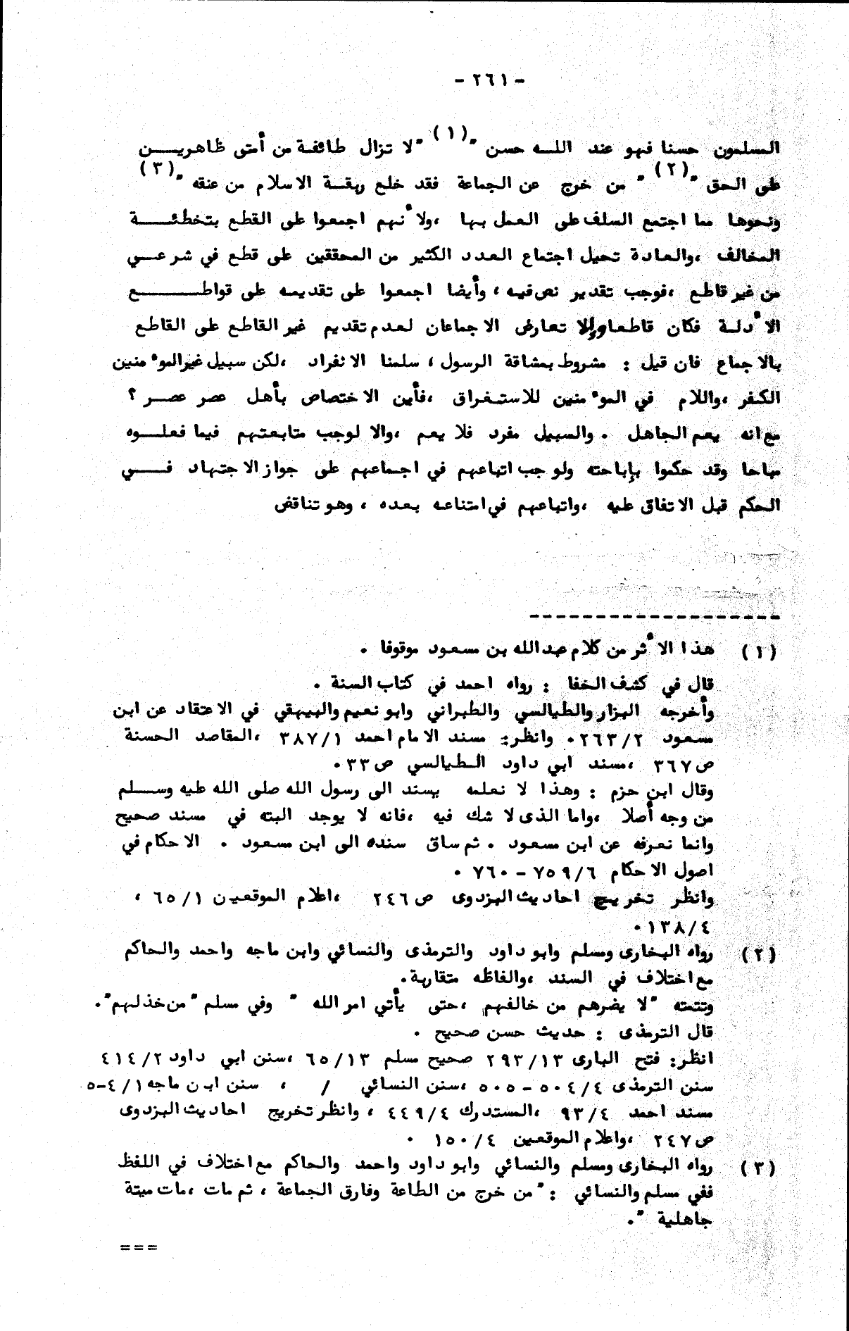 المسلمون حسنا فهو عند الله حسن"، "لا تزال طائفة من أمتي ظاهرين على الحق"، "من خرج عن الجماعة فقد خلع ربقة الإسلام من عنقه" ونحوها مما اجتمع السلف على العمل بها، ولأنهم أجمعوا على القطع بتخطئة المخالف، والعادة تحيل اجتماع العدد الكثير من المحققين على قطع في شرعي من غير قاطع، فوجب تقدير نص فيه، وأيضا أجمعوا على تقديمه على قواطع الأدلة فكان قاطعا، وإلا تعارض الإجماعان لعدم تقديم غير القاطع على القاطع بالإجماع، فإن قيل: مشروط بمشاقة الرسول، سلمنا الانفراد، ولكن سبيل غير المؤمنين الكفر، واللام في المؤمنين للاستغراق، فأين الاختصاص بأهل عصر عصر؟ مع أنه يعم الجاهل. والسبيل مفرد فلا يعم، وإلا لوجب متابعتهم فيما فعلوه مباحا وقد حكموا بإباحته ولوجب اتباعهم في إجماعهم على جواز الاجتهاد في الحكم قبل الاتفاق عليه، واتباعهم في امتناعه بعده، وهو تناقض