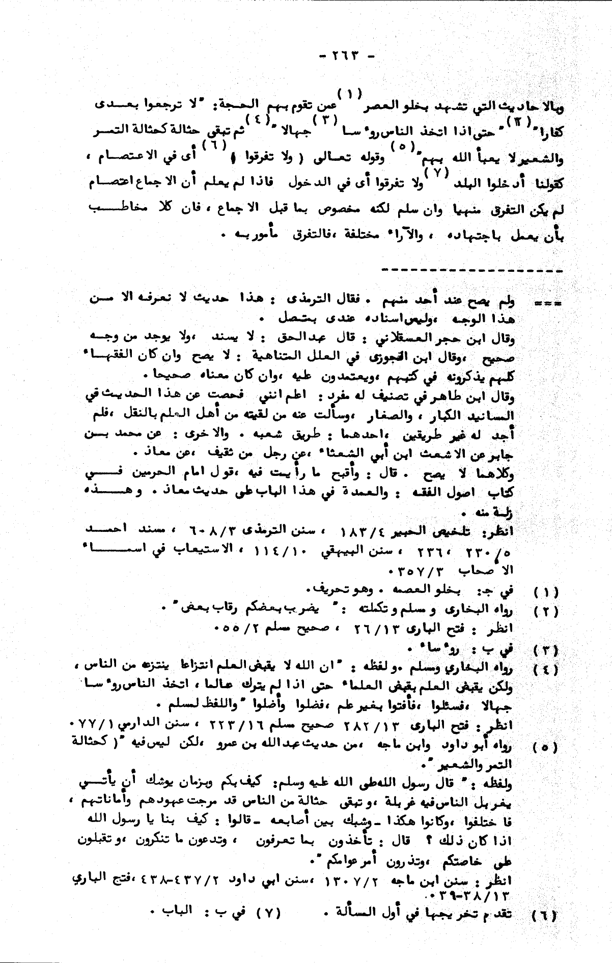 وبالأحاديث التي تشهد بخلو العصر عمن تقوم بهم الحجة: "لا ترجعوا بعدي كفارا" "حتى إذا اتخذ الناس رؤوسا جهالا" "ثم تبقى حثالة كحثالة التمر والشعير لا يعبأ الله بهم" وقوله تعالى: {ولا تفرقوا} أي في الاعتصام، كقولنا: (ادخلوا البلد، ولا تفرقوا)؛ أي في الدخول، فإذا لم يعلم أن الإجماع اعتصام لم يكن التفرق منهيا وإن سلم لكنه مخصوص بما قبل الإجماع، فإن كلا مخاطب بأن يعمل باجتهاده، والآراء مختلفة فالتفرق مأمور به.