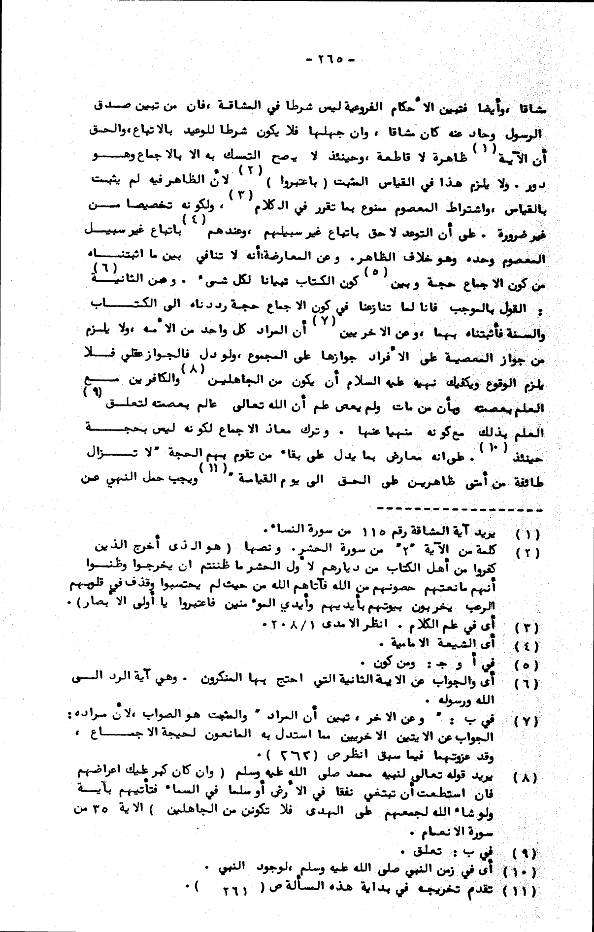 مشاقا، وأيضا فتبين الأحكام الفروعية ليس شرطا في المشاقة، فإن من تبين صدق الرسول وحاد عنه كان مشاقا، وإن جهلها فلا يكون شرطا للوعيد بالاتباع، والحق أن الآية ظاهرة لا قاطعة، وحينئذ لا يصح التمسك به إلا بالإجماع وهو دور. ولا يلزم هذا في القياس المثبت (باعتبروا) لأن الظاهر فيه لم يثبت بالقياس، واشتراط المعصوم ممنوع بما تقرر في الكلام، ولكونه تخصيصا من غير ضرورة. على أن التوعد لاحق باتباع غير سبيلهم، وعندهم باتباع غير سبيل المعصوم وحده وهو خلاف الظاهر. وعن المعارضة: أنه لا تنافي بين ما أثبتناه من كون الإجماع حجة وبين كون الكتاب تبيانا لكل شيء. وعن الثانية: القول بالموجب فإنا لما تنازعنا في كون الإجماع حجة رددناه إلى الكتاب والسنة فأثبتناه بهما، وعن الأخريين أن المراد كل واحد من الأمة، ولا يلزم من جواز المعصية على الأفراد جوازها على المجموع، ولو دل فالجواز عقلي فلا يلزم الوقوع ويكفيك نهيه عليه السلام أن يكون من الجاهلين والكافرين مع العلم بعصمته وبأن من مات ولم يعص علم أن الله تعالى عالم بعصمته لتعلق العلم بذلك مع كونه منهيا عنها. وترك معاذ الإجماع لكونه ليس بحجة حينئذ. على أنه معارض بما يدل على بقاء من تقوم بهم الحجة "لا تزال طائفة من أمتي ظاهرين على الحق إلى يوم القيامة" ويجب حمل النهي عن