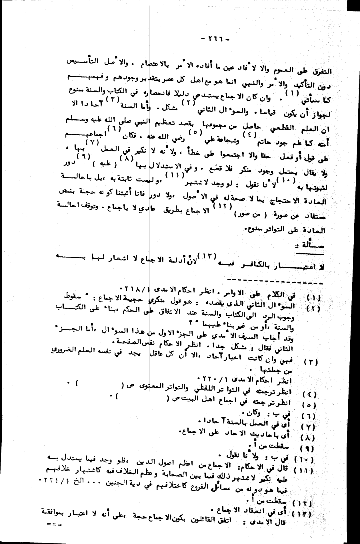 التفرق على العموم وإلا لأفاد عين ما أفاده الأمر بالاعتصام. والأصل التأسيس دون التأكيد والأمر والنهي إنما هو مع أهل كل عصر بتقدير وجودهم وفهمهم كما سيأتي. وإن كان الإجماع يستدعي دليلا فانحصاره في الكتاب والسنة ممنوع لجواز أن يكون قياسا. والسؤال الثاني مشكل. وأما السنة آحادا إلا أن العلم القطعي حاصل من مجموعها بقصد تعظيم النبي صلى الله عليه وسلم أمته كما علم جود حاتم وشجاعة علي رضي الله عنه. فكان إجماعهم على قول أو فعل حقا وإلا اجتمعوا على خطأ، ولأنه لا نكير في العمل بها، ولا يقال يحتمل وجود منكر فلا قطع، وفي الاستدلال بها (عليه) دور لثبوتها به؛ لأنا نقول: لو وجد لاشتهر، وليست ثابتة به، بل بإحالة العادة الاحتجاج بما لا صحة له في الأصول، ولا دور فإنا أثبتنا كونه حجة بنص مستفاد عن صورة (من صور) الإجماع بطريق عادي لا بإجماع. وتوقف إحالة العادة على التواتر ممنوع.