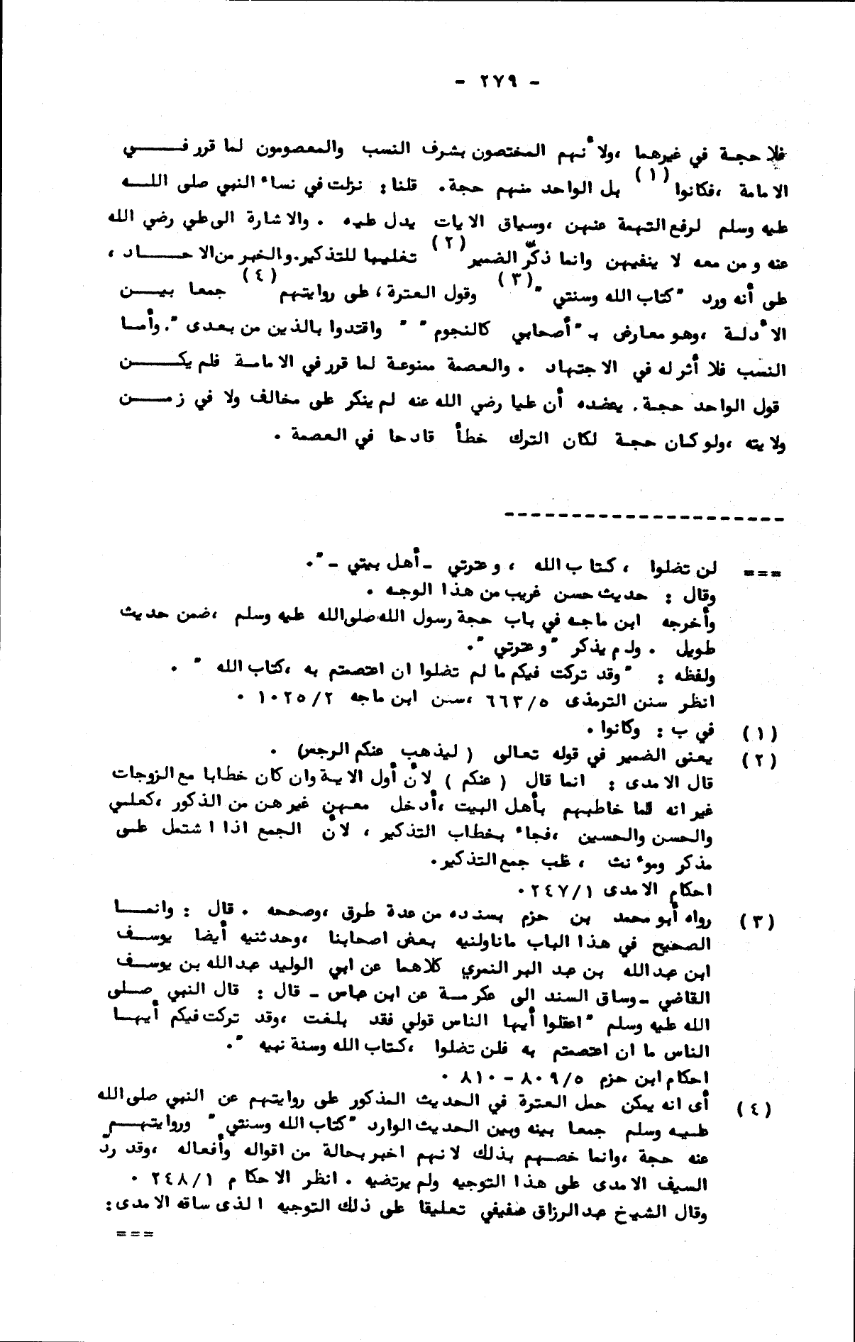 فلا حجة في غيرهما، ولأنهم المختصون بشرف النسب والمعصومون لما قرر في الإمامة، فكانوا بل الواحد منهم حجة. قلنا: نزلت في نساء النبي صلى الله عليه وسلم لرفع التهمة عنهن، وسياق الآيات يدل عليه. والإشارة إلى علي رضي الله عنه ومن معه لا ينفيهن وإنما ذكر الضمير تغليبا للتذكير. والخبر من الآحاد، على أنه ورد "كتاب الله وسنتي" وقول العترة على روايتهم جمعا بني الأدلة وهو معارض بـ"أصحابي كالنجوم" و"اقتدوا باللذين من بعدي" وأما النسب فلا أثر له في الاجتهاد، والعصمة ممنوعة لما قرر في الإمامة فلم يكن قول الواحد حجة. يعضده أن عليا رضي الله عنه لم ينكر على مخالف ولا في زمن ولايته، ولو كان حجة لكان الترك خطأ قادحا في العصمة.