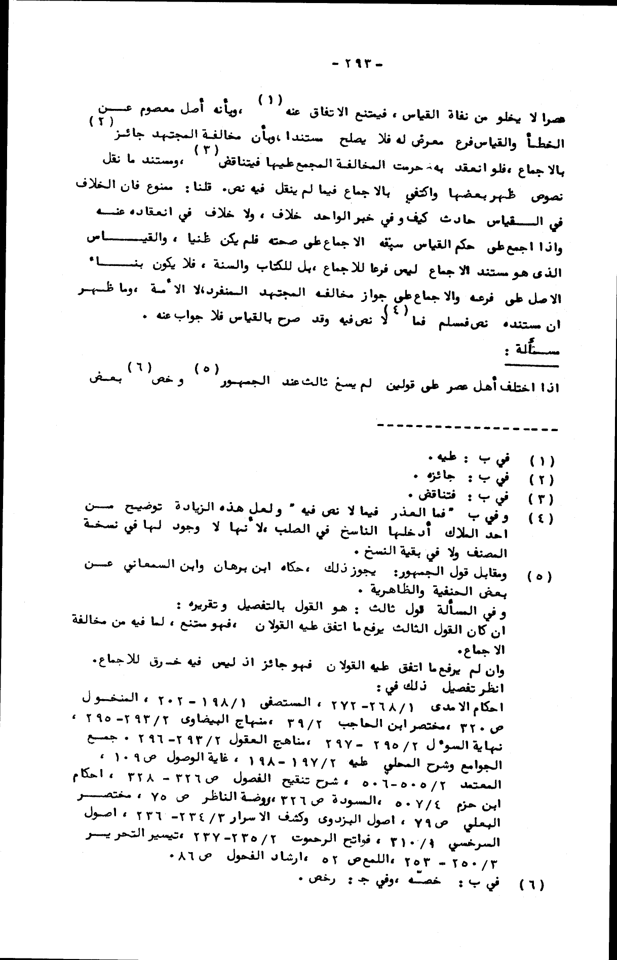 عصرا لا يخلو من نفاة القياس، فيمتنع الاتفاق عليه، وبأنه أصل معصوم عن الخطأ والقياس فرع معرض له فلا يصلح مستندا، وبأن مخالفة المجتهد جائز بالإجماع، فلو انعقد به حرمت المخالفة المجمع عليها فيتناقض، ومستند ما نقل نصوص ظهر بعضها واكتفي بالإجماع فيما لم ينقل فيه نص. قلنا: ممنوع؛ فإن الخلاف في القياس حادث كيف وفي خبر الواحد خلاف، ولا خلاف في انعقاده عنه وإذا أجمع على حكم القياس سبقه الإجماع على صحته فلم يكن ظنيا، والقياس الذي هو مستند الإجماع ليس فرعا للإجماع، بل للكتاب والسنة، فلا يكون بناء الأصل على فرعه والإجماع على جواز مخالفة المجتهد المنفرد لا الأمة، وما ظهر أن مستنده نص فسلم فما لا نص فيه وقد صرح بالقياس فلا جواب عنه.