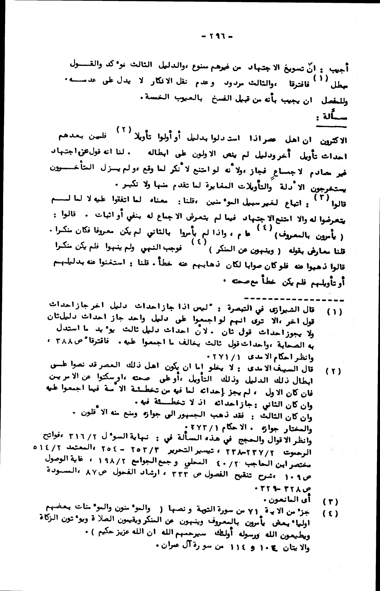 قالوا: اتباع لغير سبيل المؤمنين، قلنا: معناه لما اتفقوا عليه لا لما لم يتعرضوا له وإلا امتنع الاجتهاد فيما لم يتعرض الإجماع له بنفي أو إثبات. قالوا: {يأمرون بالمعروف} عام، وإذا لم يأمروا بالثاني لم يكن معروفا فكان منكرا. قلنا معارض بقوله: {وينهون عن المنكر} فوجب النهي ولم ينهوا فلم يكن منكرا، قالوا: ذهبوا عنه فلو كان صوابا كان ذهابهم عنه خطأ. قلنا: استغنوا عنه بدليلهم أو تأويلهم فلم يكن خطأ مع صحته.