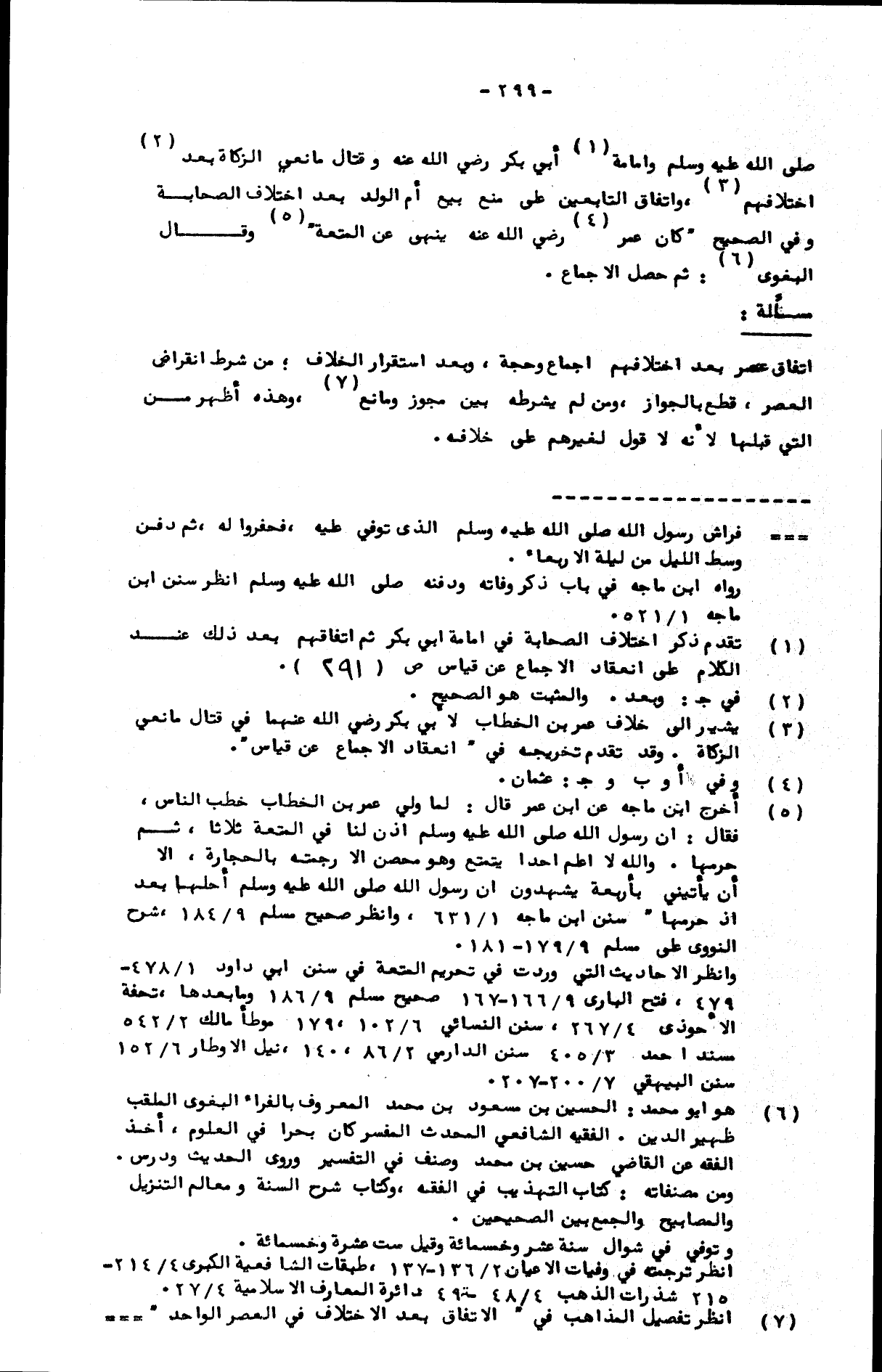 صلى الله عليه وسلم وإمامة أبي بكر رضي الله عنه وقتال مانعي الزكاة بعد اختلافهم، واتفاق التابعين على منع بيع أم الولد بعد اختلاف الصحابة وفي الصحيح كان عمر رضي الله عنه ينهى عن المتعة، وقال البغوي: ثم حصل الإجماع.