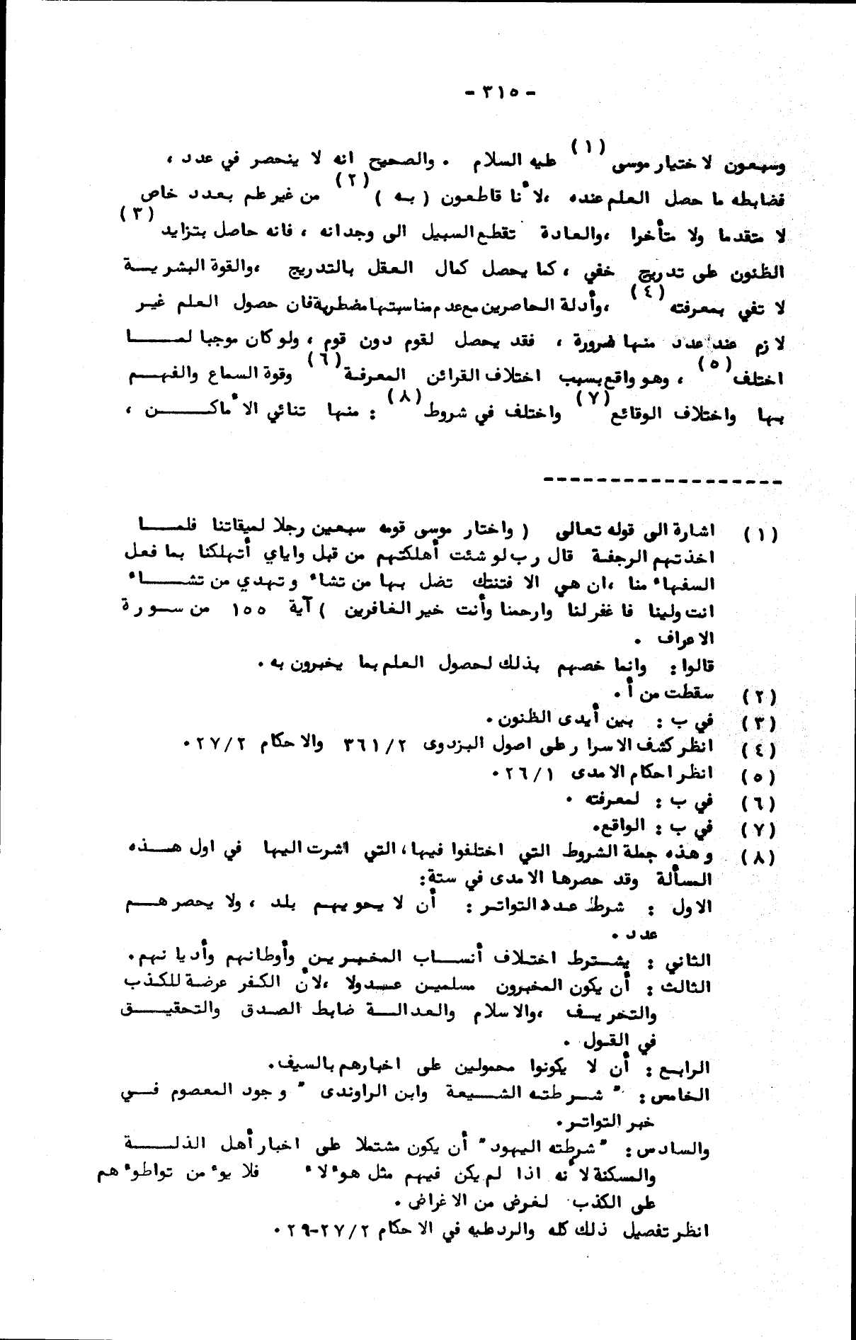 وسبعون لاختيار موسى عليه السلام. والصحيح أنه لا ينحصر في عدد، فضاطبه ما حصل العلم عنده؛ لأنا قاطعون (به) من غير علم بعدد خاص لا متقدما ولا متأخرا، والعادة تقطع السبيل إلى وجدانه، فإنه حاصل بتزايد الظنن على تدريج خفي، كما يحصل كمال العقل بالتدريج، والقوة البشرية لا تفي بمعرفته، وأدلة الحاصرين مع عدم مناسبتها مضطربة، فإن حصول العلم غير لازم عند عدد منها ضرورة، فقد يحصل لقوم دون قوم، ولو كان موجبا لما اختلف، وهو واقع بسبب اختلاف القرائن المعرفة وقوة السماع والفهم بها واختلاف الوقائع واختلف في شروط: منها تنائي الأماكن،