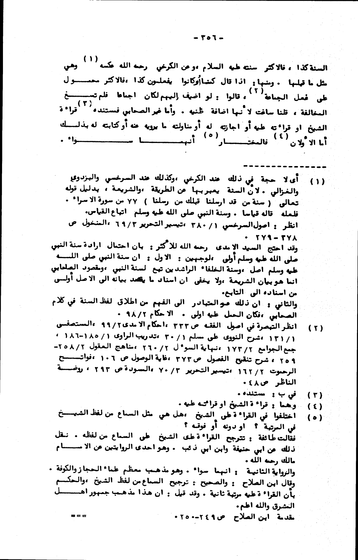 السنة كذا، فالأكثر سنته عليه السلام، وعن الكرخي رحمه الله عكسه، وهي مثل ما قبلها. ومنها: إذا قال: كنا أو كانوا يفعلون كذا، فالأكثر محمول على فعل الجماعة، قالوا: لو أضيف إليهم لكان إجماعا فلم تسغ المخالفة، قلنا: ساغت لأنها إضافة ظنية، وأما غير الصحابي فمستنده قراءة الشيخ أو قراءته عليه أو إجازته له أو مناولته ما يرويه عنه أو كتابته له بذلك، أما الأولان فالمختار أنهما سواء.
