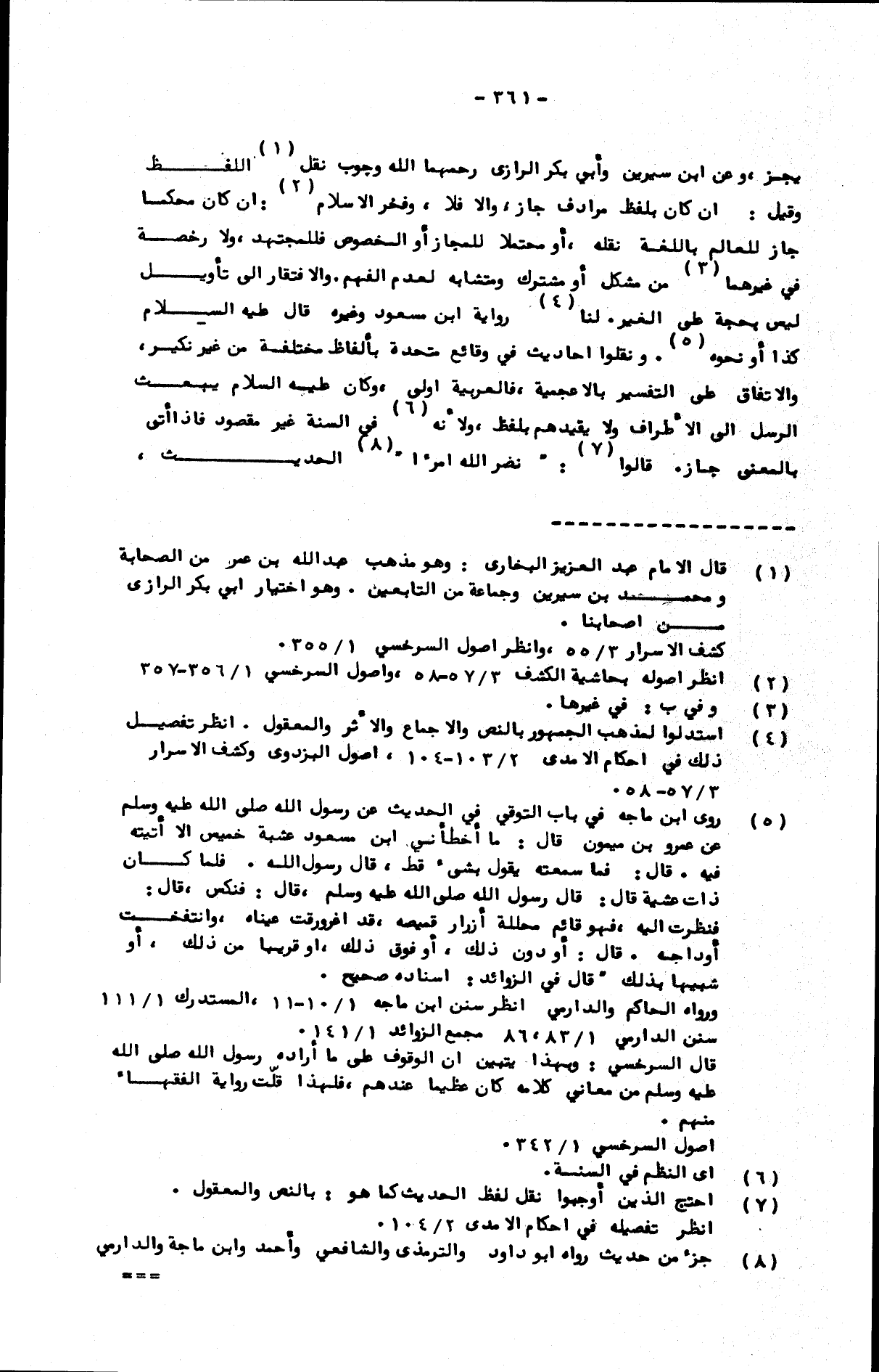 يجز، وعن ابن سيرين وأبي بكر الرازي رحمهما الله وجوب نقل اللفظ، وقيل: إن كان بلفظ مرادف جاز، وإلا فلا، وفخر الإسلام: إن كان محكما جاز للعالم باللغة نقله، أو محتملا للمجاز أو المخصوص فللمجتهد، ولا رخصة في غيرهما من مشكل أو مشترك ومتشابه لعدم الفهم. والافتقار إلى تأويل ليس بحجة على الغير. لنا رواية ابن مسعود وغيره قال عليه السلام كذا أو نحوه. ونقلوا أحاديث في وقائع متحدة بألفاظ مختلفة من غير نكير، والاتفاق على التفسير بالأعجمية، فالعربية أولى، وكان عليه السلام يبعث الرسل إلى الأطراف ولا يقيدهم بلفظ، ولأنه في السنة غير مقصود، فإذا أتى بالمعنى جاز. قالوا: نضر الله امرأ الحديث،