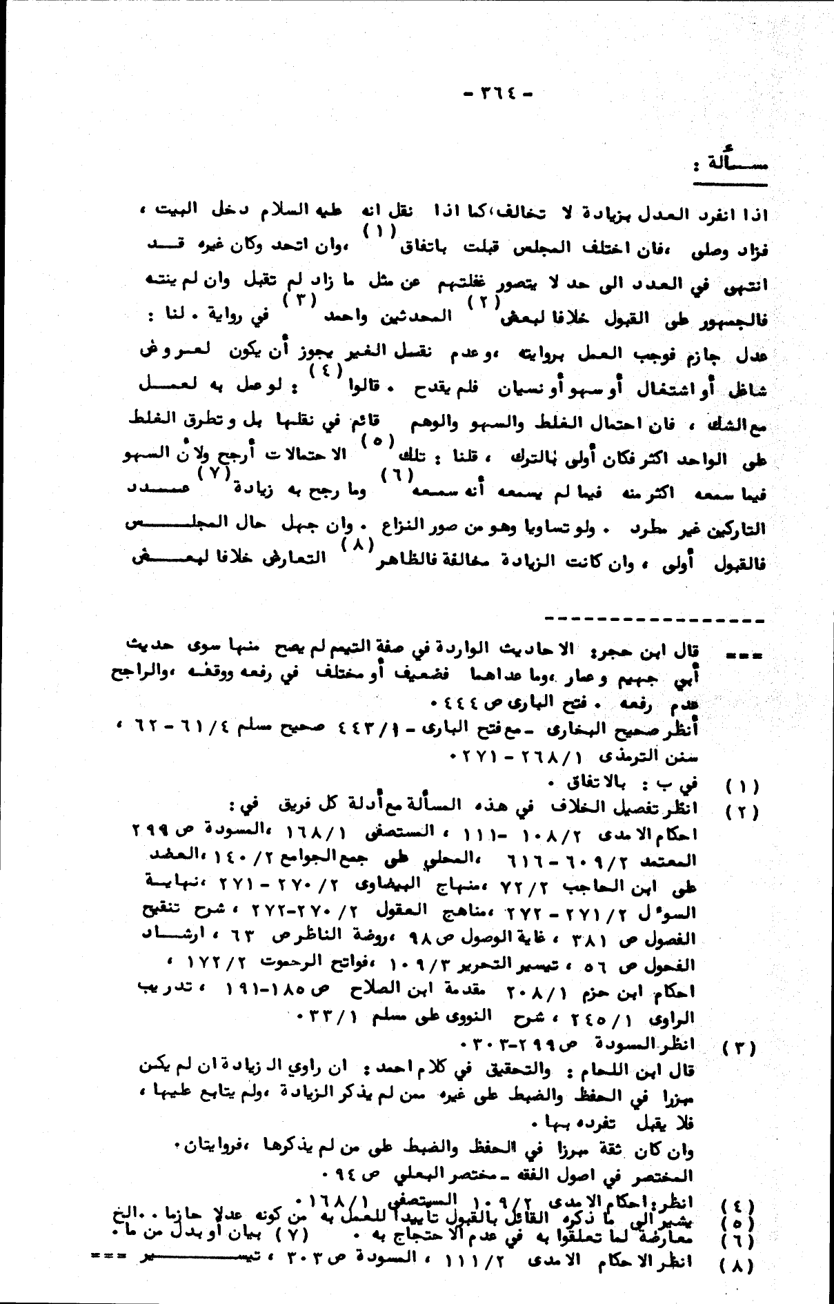 إذا انفرد العدل بزيادة لا تخالف، كما إذا نقل أنه عليه السلام دخل البيت، فزاد وصلى، فإن اختلف المجلس قبلت باتفاق، وإن اتحد وكان غيره قد انتهى في العدد إلى حد لا يتصور غفلتهم عن مثل ما زاد لم تقبل وإن لم ينته فالجمهور على القبول خلافا لبعض المحدثين وأحمد في رواية. لنا: عدل جازم فوجب العمل بروايته، وعدم نقل الغير يجوز أن يكون لعروض شاغل أو اشتغال أو سهو أو نسيان فلم يقدح. قالوا: لو عمل به لعمل مع الشك، فإن احتمال الغلط والسهو والوهم قائم في نقلها بل وتطرق الغلط على الواحد أكثر فكان أولى بالترك، قلنا: تلك الاحتمالات أرجح ولأن السهو فيما سمعه أكثر منه فيما لم يسمعه أنه سمعه، وما رجح به زيادة عدد التاركين غير مطرد. ولو تساويا وهو من صور النزاع. وإن جهل حال المجلس فالقبول أولى، وإن كانت الزيادة مخالفة فالظاهر التعارض خلافا لبعض