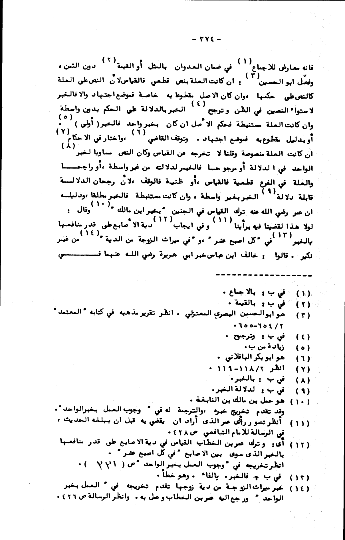 فإنه معارض للإجماع في ضمان العدوان بالمثل أو القيمة دون الثمن، وفصل أبو الحسين: إن كانت العلة بنص قطعي فالقياس لأن النص على العلة كالنص على حكمها، وإن كان الأصل مقطوعا به خاصة فموضع اجتهاد وإلا فالخبر لاستواء النصين في الظن وترجح الخبر بالدلالة على الحكم بدون واسطة وإن كانت العلة مستنبطة فحكم الأصل إن كان بخبر واحد فالخبر (أولى) أو بدليل مقطوع به فموضع اجتهاد. وتوقف القاضي، واختار في الأحكام إن كانت العلة منصوصة وقلنا لا تخرجه عن القياس وكان النص مساويا لخبر الواحد في الدلالة أو مرجوحا فالخبر لدلالته من غير واسطة، أو راجحا والعلة في الفرع قطعية فالقياس، أو ظنية فالوقف، لأن رجحان الدلالة قابلة [قابله] دلالة الخبر بغير واسطة، وإن كانت مستنبطة فالخبر مطلقا، ودليله أن عمر رضي الله عنه ترك القياس في الجنين بخبر ابن مالك، وقال: لولا هذا لقضينا فيه برأينا، وفي إيجاب دية الأصابع على قدر منافعها بالخبر في كل إصبع عشر وفي ميراث الزوجة من الدية من غير نكير. قالوا: خالف ابن عباس خبر أبي هريرة رضي الله عنهما في