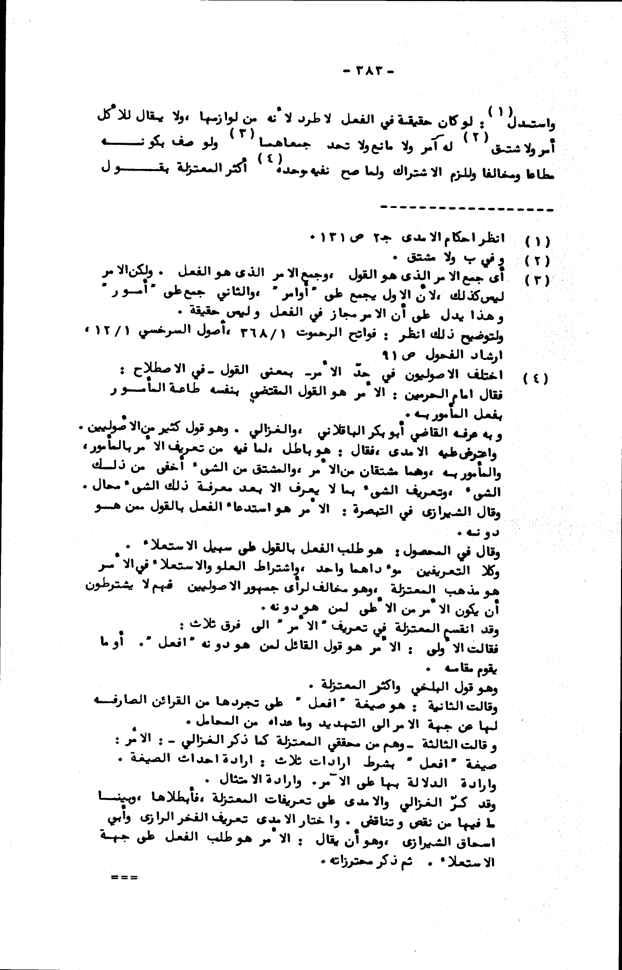 واستدل: لو كان حقيقة في الفعل لاطرد لأنه من لوازمها، ولا يقال للأكل أمر ولاشتق له آمر ولا مانع ولاتحد جمعاهما ولوصف بكونه مطاعا ومخالفا وللزم الاشتراك ولما صح نفيه. وحَدَّه أكثر المعتزلة بقول