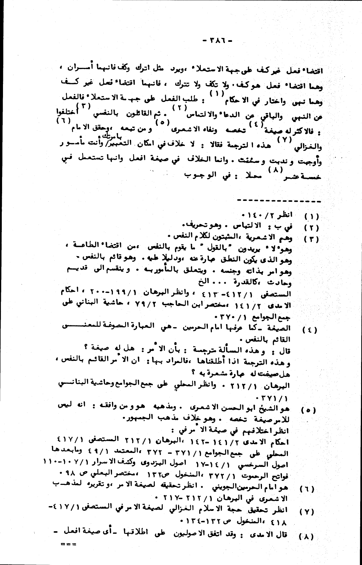 اقتضاء فعل غير كف على جهة الاستعلاء، ويرد مثل اترك وكف فإنهما أمران، وهما اقتضاء فعل هو كف. ولا تكف ولا تترك، فإنهما اقتضاء فعل غير كف، وهما نهي واختار في الأحكام: طلب الفعل على جهة الاستعلاء، فالفعل عن النهي والباقي عن الدعاء والالتماس. ثم القائلون بالنفسي اختلفوا؛ فالأكثر له صيغة تخصه ونفاه الأشعري ومن تبعه، وحقق الإمام والغزالي هذه الترجمة فقالا: لا خلاف في إمكان التعبير بأمرتك وأنت مأمور وأوجبت وندبت وسخطت [؟] وإنما الخلاف في صيغة افعل وأنها تستعمل في خمسة عشر محلا: في الوجوب