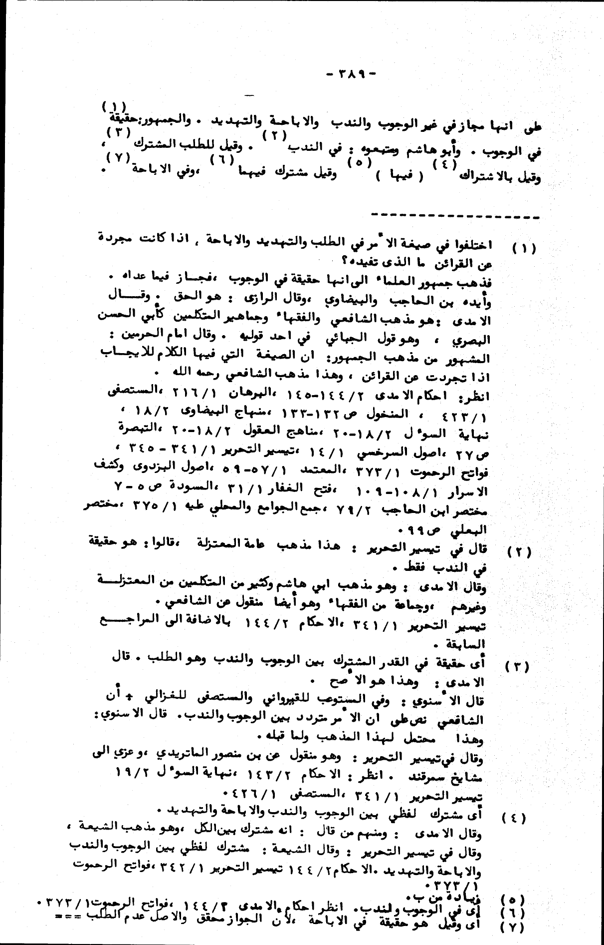 على أنها مجاز في غير الوجوب والندب والإباحة والتهديد. والجمهور: حقيقة في الوجوب. وأبو هاشم ومتبعوه: في الندب. وقيل للطلب المشترك، وقيل بالاشتراك (فيها) وقيل مشترك فيهما وفي الإباحة.
