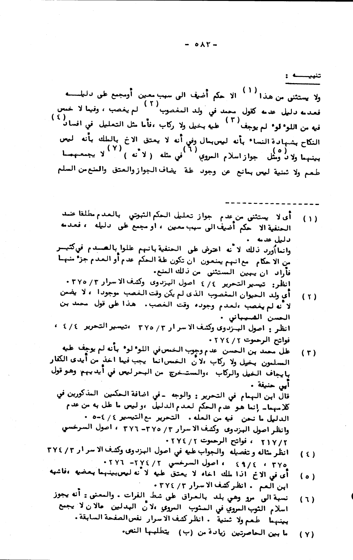 ولا يستثنى من هذا إلا حكم أضيف إلى سبب معين أو مجمع على دليله فعدمه دليل عدمه كقول محمد في ولد المغصوب لم يغصب، وفيما لا خمس فيه من اللؤلؤ لم يوجف عليه بخيل ولا ركاب، فأما مثل التعليل في إفساد النكاح بشهادة النساء بأنه ليس بمال وفي أنه لا يعتق الأخ بالملك بأنه ليس بينهما ولاد ومثل جواز إسلام المروي في مثله (لأنه) لا يجمعهما طعم ولا ثمنية ليس بمانع عن وجود علة يضاف الجواز والعتق والمنع من السلم
