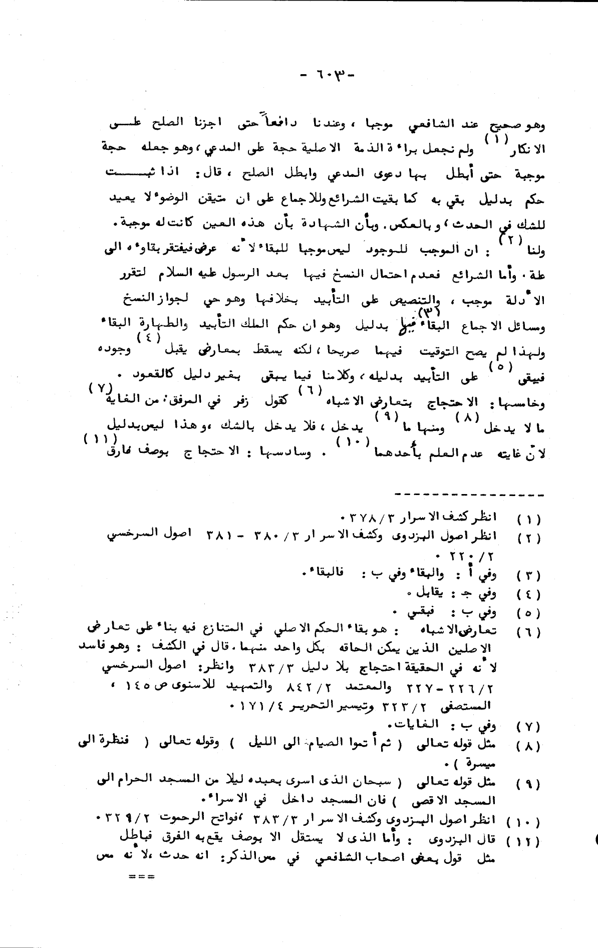 وهو صحيح عند الشافعي موجبا، وعندنا دافعا حتى أجزنا الصلح على الإنكار ولم نجعل براءة الذمة الأصلية حجة على المدعي، وهو جعله حجة موجبة حتى أبطل بها دعوى المدعي وأبطل الصلح، قال: إذا ثبت حكم بدليل بقي به كما بقيت الشرائع، وللإجماع على أن متيقن الوضوء لا يعيد للشك في الحدث، وبالعكس. وبأن الشهادة بأن هذه العين كانت له موجبة. ولنا: أن الموجب للوجود ليس موجبا للبقاء لأنه عرض فيفتقر بقاؤه إلى علة. وأما الشرائع فعدم احتمال النسخ فيها بعد الرسول عليه السلام لتقرر الأدلة موجب، والتنصيص على التأبيد بخلافها وهو حي لجواز النسخ ومسائل الإجماع البقاء فيها بدليل وهو أن حكم الملك التأبيد والطهارة البقاء ولهذا لم يصح التوقيت فيهما صريحا، لكنه يسقط بمعارض يقبل وجوده فيبقى على التأبيد بدليله، وكلامنا فيما يبقى بغير دليل كالقعود. وخامسها: الاحتجاج بتعارض الأشباه كقول زفر في المرفق: من الغاية ما لا يدخل ومنها ما يدخل، فلا يدخل بالشك، وهذا ليس بدليل لأن غايته عدم العلم بأحدهما. وسادسها: الاحتجاج بوصف فارق