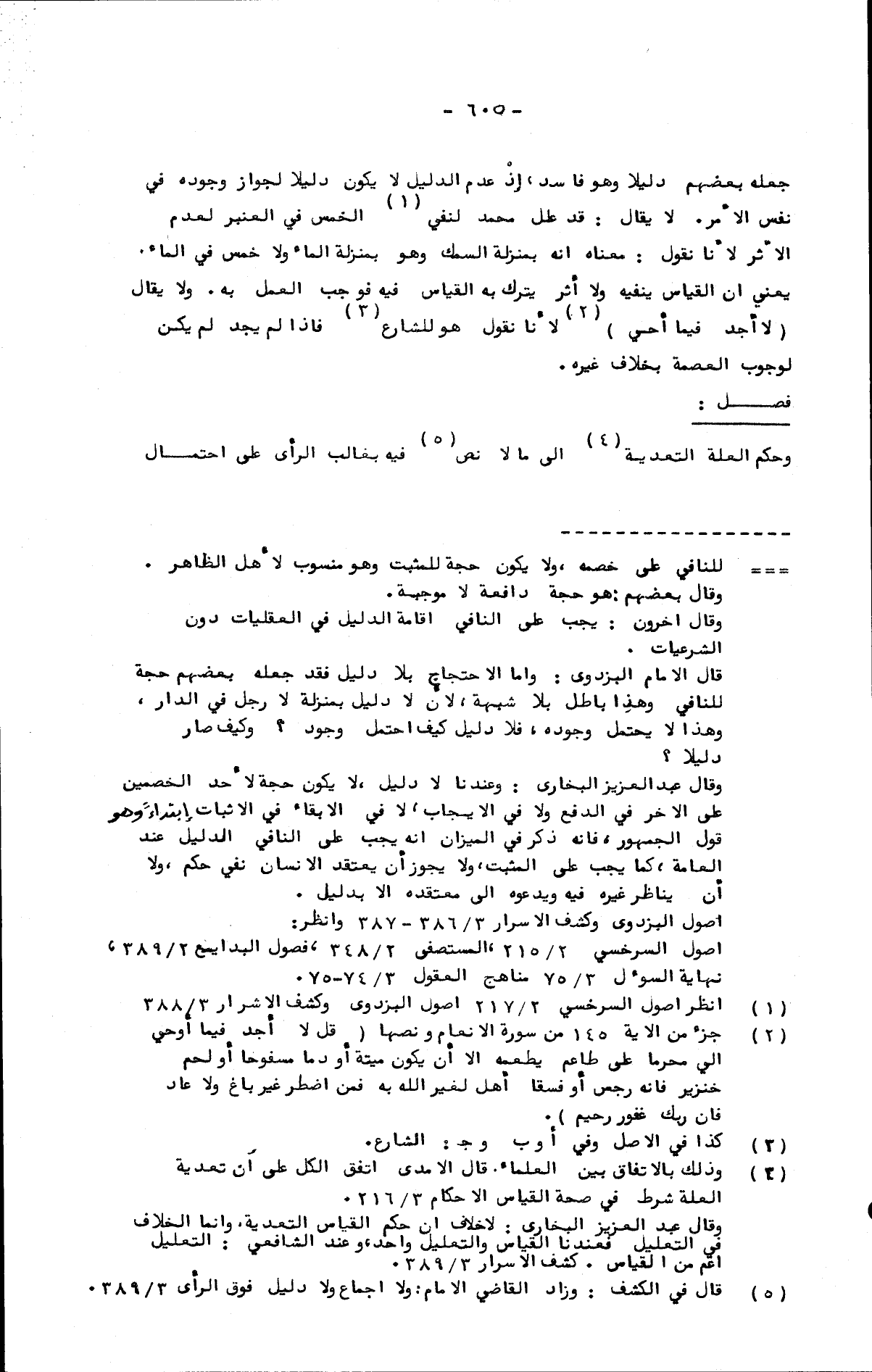 جعله بعضهم دليلا وهو فاسد، إذ عدم الدليل لا يكون دليلا لجواز وجوده في نفس الأمر. لا يقال: قد علل محمد لنفي الخمس في العنبر لعدم الأثر لأنا نقول: معناه أنه بمنزلة السمك وهو بمنزلة الماء ولا خمس في الماء. بمعنى أن القياس ينفيه ولا أثر يترك به القياس فيه فوجب العمل به. ولا يقال {لا أجد فيما أوحي} لأنا نقول هو للشارع فإذا لم يجد لم يكن لوجوب العصمة بخلاف غيره.