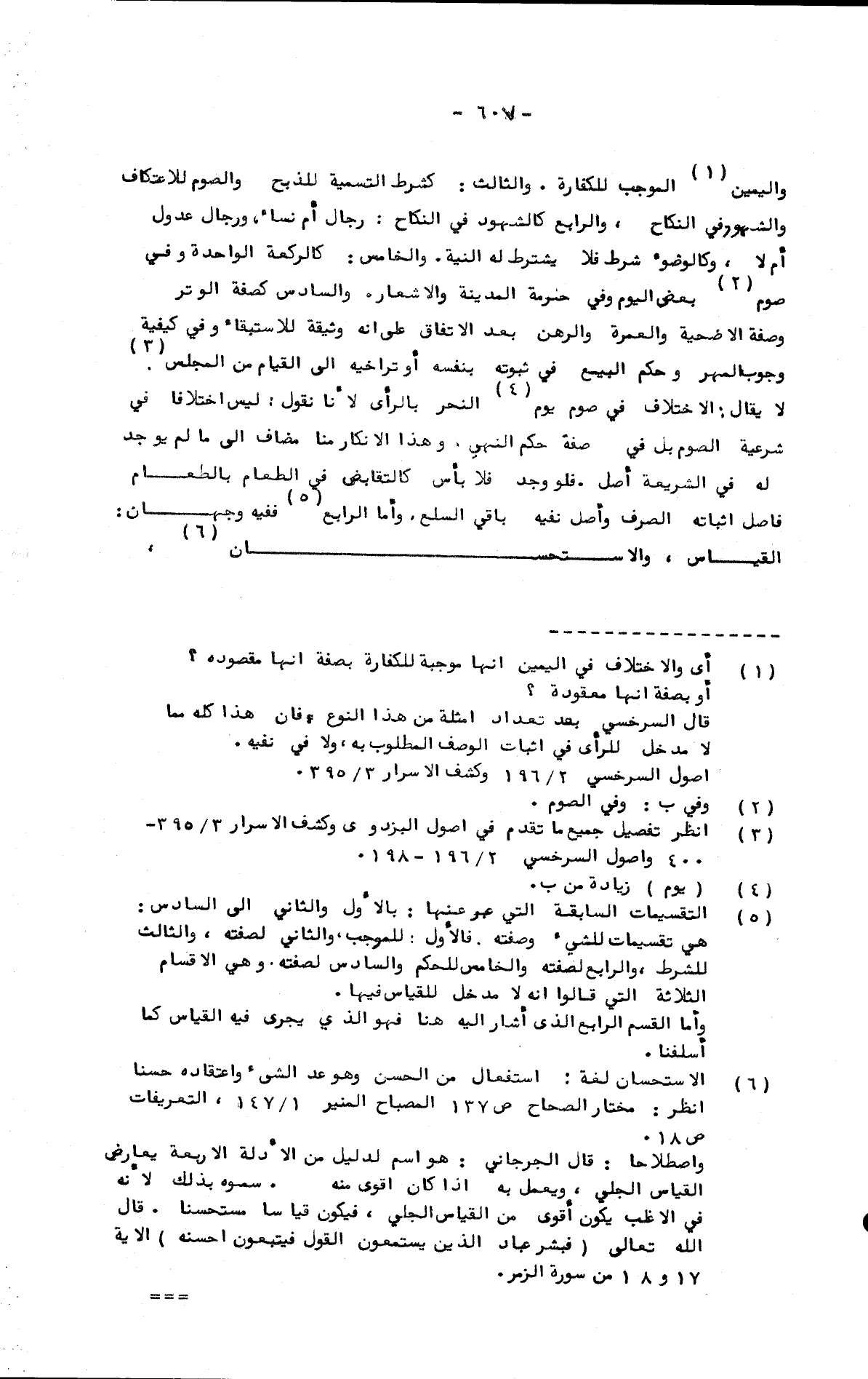 واليمين الموجب للكفارة. والثالث: كشرط التسمية للذبح والصوم للاعتكاف والشهود في النكاح، والرابع كالشهود في النكاح: رجال أم نساء، ورجال عدول أم لا، وكالوضوء شرط فلا يشترط له النية. والخامس: كالركعة الواحدة وفي صوم بعض اليوم وفي حرمة المدينة والأشعار. والسادس كصفة الوتر وصفة الأضحية والعمرة والرهن بعد الاتفاق على أنه وثيقة للاستبقاء وفي كيفية وجوب المهر وحكم البيع في ثبوته بنفسه أو تراخيه إلى القيام من المجلس، لا يقال: الاختلاف في صوم يوم النحر بالرأي لأنا نقول: ليس اختلافا في شرعية الصوم بل في صفة حكم النهي، وهذا الإنكار منا مضاف إلى ما لم يوجد له في الشريعة أصل. فلو وجد فلا بأس كالتقابض في الطعام بالطعام فأصل إثباته الصرف وأصل نفيه باقي السلع، وأما الرابع ففيه وجهان: القياس والاستحسان،