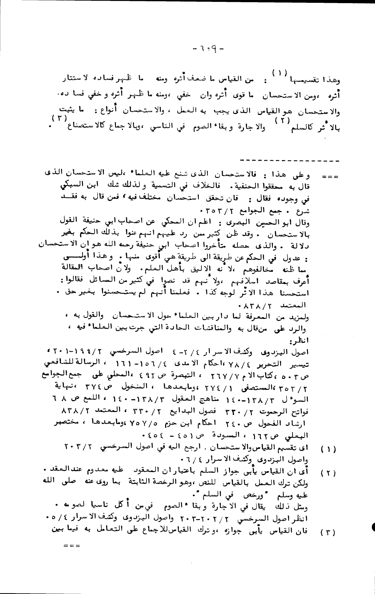 وهذا تقسيمها: من القياس ما ضعف أثره ومنه ما ظهر فساده لاستتار أثره، ومن الاستحسان ما قوي أثره وإن خفي، ومنه ما ظهر أثره وخفي فساده. والاستحسان هو القياس الذي يجب به العمل، والاستحسان أنواع: ما يثبت بالأثر كالسلم والإجارة وبقاء الصوم في الناسي، وبالإجماع كالاستصناع.