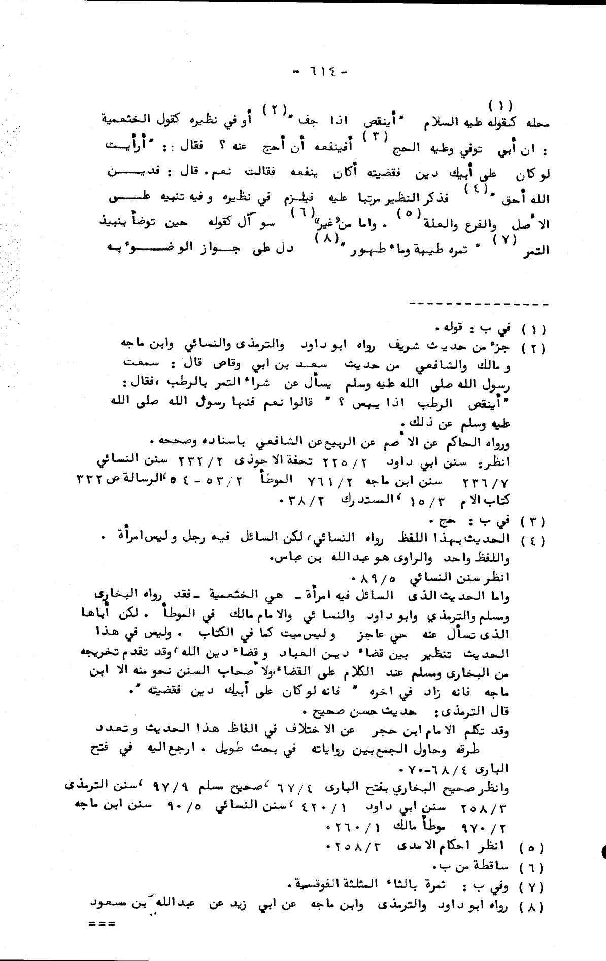 محله كقوله عليه السلام "أينقص إذا جف" أو في نظيره كقول الخثعمية: إن أبي توفي وعليه الحج، أفينفعه أن أحج عنه؟ فقال: "أرأيت لو كان على أبيك دين فقضيته أكان ينفعه فقالت نعم. قال: فدين الله أحق" فذكر النظير مرتبا عليه فيلزم في نظيره وفيه تنبيه على الأصل والفرع والعلة. وإما من "غير" سؤال كقوله حين توضأ بنبيذ التمر "تمرة طيبة وماء طهور" دل على جواز الوضوء به