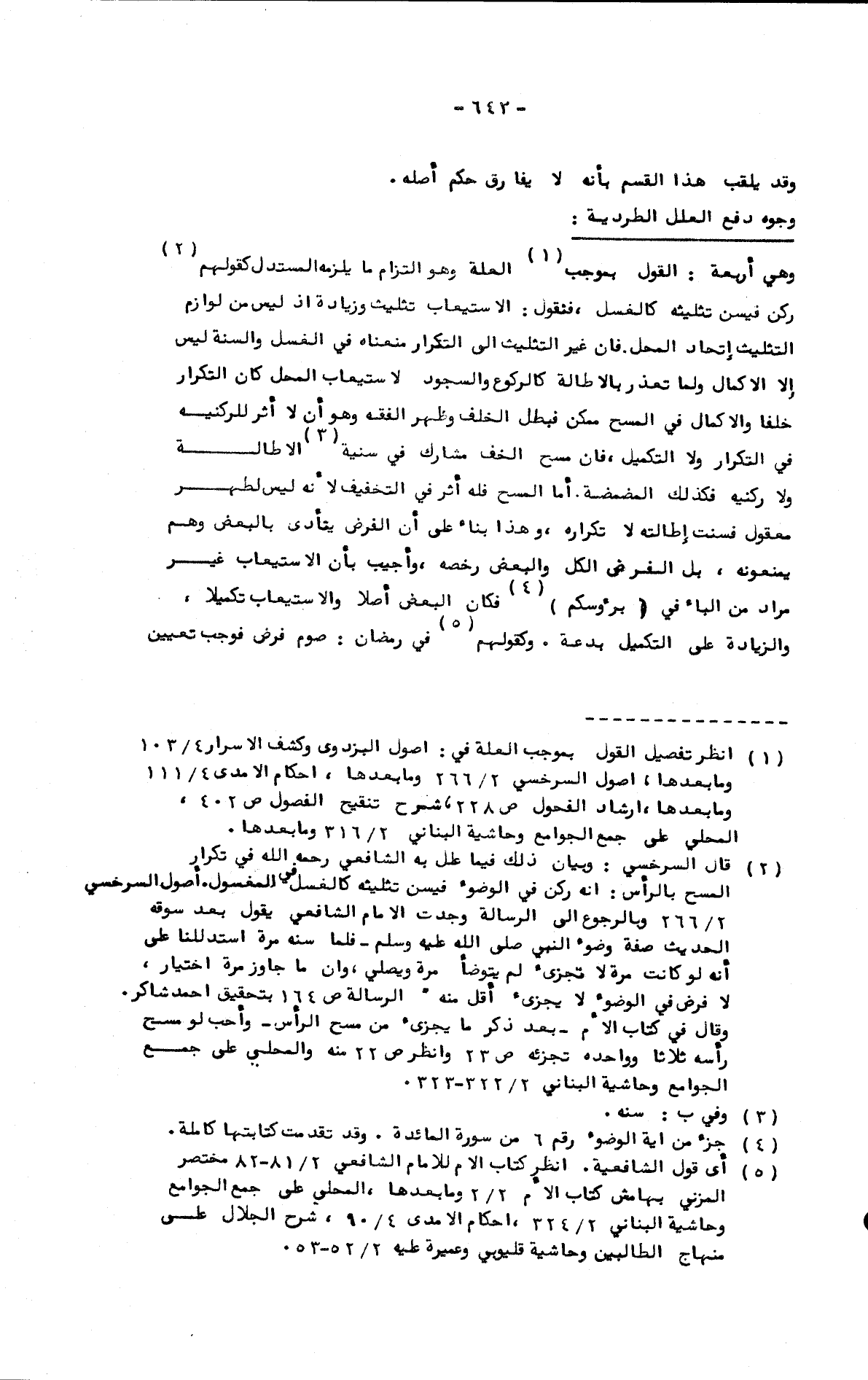 وهي أربعة: القول بموجب العلة وهو التزام ما يلزمه المستدل كقولهم ركن فيسن تثليثه كالغسل، فنقول: الاستيعاب تثليث وزيادة إذ ليس من لوازم التثليث اتحاد المحل. فإن غير التثليث إلى التكرار منعناه في الغسل والسنة ليس إلا الإكمال ولما تعذر بالإطالة كالركوع والسجود لاستيعاب المحل كان التكرار خلفا والإكمال في المسح ممكن فبطل الخلف وظهر الفقه وهو أن لا أثر للركنية في التكرار ولا التكميل، فإن مسح الخف مشارك في سنية الإطالة ولا ركنية فكذلك المضمضة. أما المسح فله أثر في التخفيف لأنه ليس لطهر معقول فسنت إطالته لا تكراره، وهذا بناء على أن الفرض يتأدى بالبعض وهو يمنعونه، بل الفرض الكل والبعض رخصة، وأجيب بأن الاستيعاب غير مراد من الباء في {برؤوسكم} فكان البعض أصلا والاستيعاب تكميلا، والزيادة على التكميل بدعة. وكقولهم في رمضان: صوم فرض فوجب تعيين