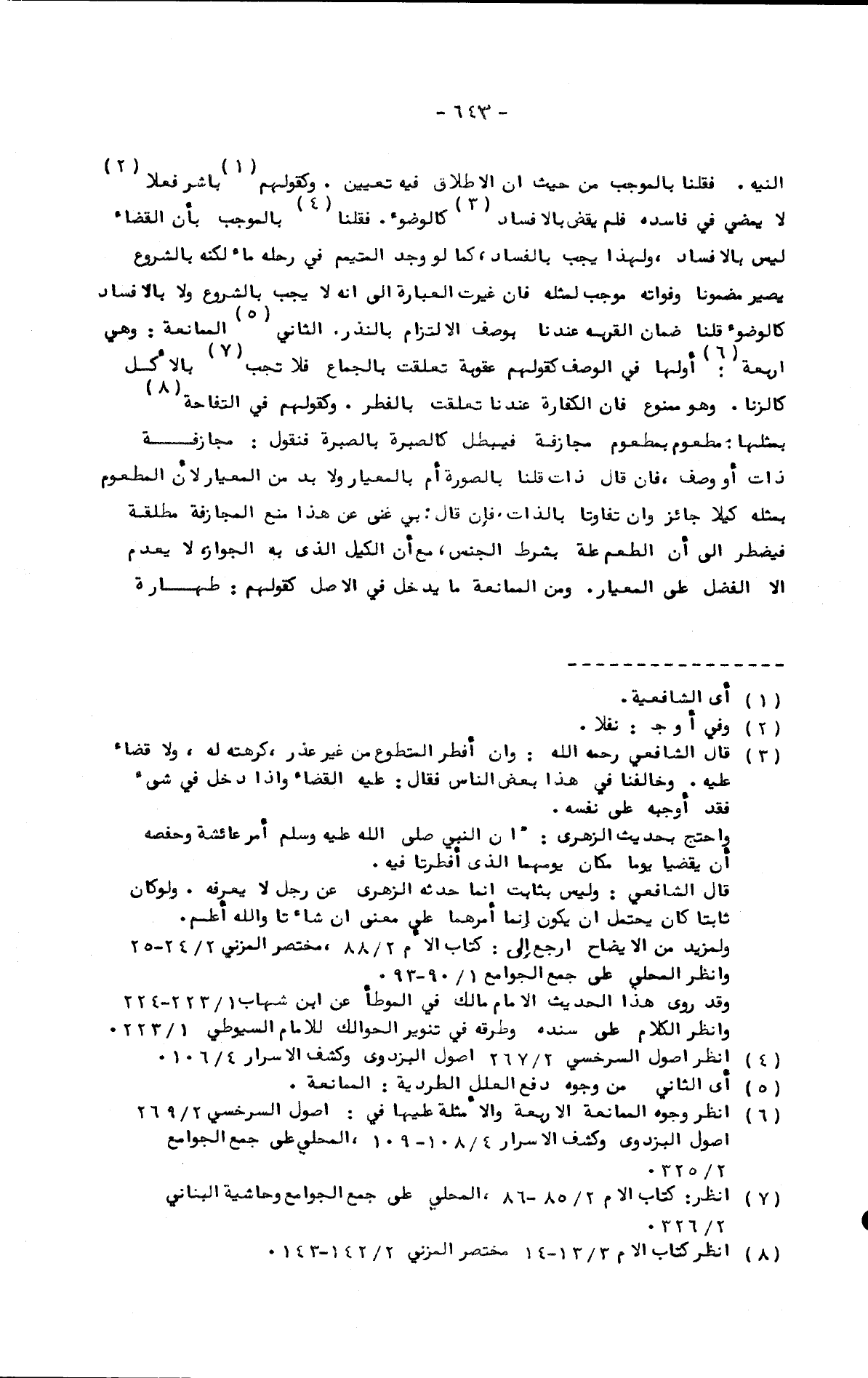 النية. فقلنا بالموجب من حيث إن الإطلاق فيه تعيين. وكقولهم باشر فعلا لا يمضي في فاسده فلم يقض بالإفساد كالوضوء. فقلنا بالموجب بأن القضاء ليس بالإفساد، ولهذا يجب بالفساد، كما لو وجد المتيمم في رحله ماء لكنه بالشرع يصير مضمونا وفواته موجب لمثله فإن غيرت العبارة إلى أنه لا يجب بالشروع ولا بالإفساد كالوضوء قلنا ضمان القربة عندنا بوصف الالتزام بالنذر. الثاني الممانعة: وهي أربعة: أولها في الوصف كقولهم عقوبة تعلقت بالجماع فلا تجب بالأكل كالزنا. وهو ممنوع فإن الكفارة عندنا تعلقت بالفطر. وكقولهم في التفاحة بمثلها: مطعوم بمطعوم مجازفة فيبطل كالصبرة بالصبرة فنقول: مجازفة ذات أو وصف، فإن قال ذات قلنا بالصورة أم بالمعيار ولا بد من المعيار لأن المطعوم بمثله كيلا جائز وإن تفاوتا بالذات. فإن قال: بي غنى عن هذا منع المجازفة مطلقة فيضطر إلى أن الطعم علة بشرط الجنس، مع أن الكيل الذي به الجواز لا يعدم إلا الفضل على المعيار. ومن الممانعة ما يدخل في الأصل كقولهم: طهارة