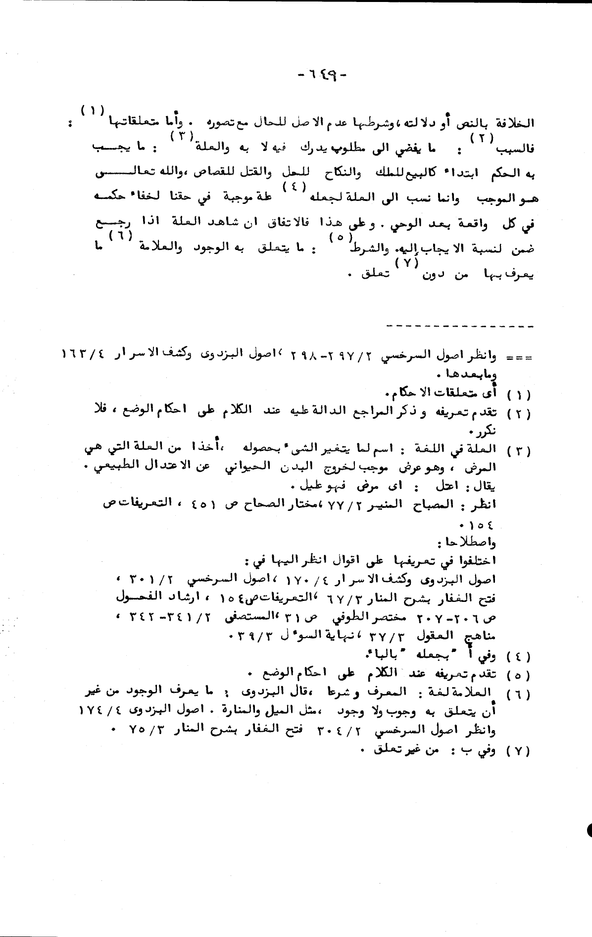 الخلافة بالنص أو دلالته، وشرطها عدم الأصل للحال مع تصوره. وأما متعلقاتها فالسبب: ما يفضي إلى مطلوب يدرك فيه لا به والعلة: ما يجب به الحكم ابتداء كالبيع للملك والنكاح للحل والقتل للقصاص، والله تعالى هو الموجب وإنما نسب إلى العلة لجعله علة موجبة في حقنا لخفاء حكمه في كل واقعة بعد الوحي. وعلى هذا فالاتفاق أن شاهد العلة إذا رجع ضمن لنسبة الإيجاب إليه. والشرط: ما يتعلق به الوجود والعلامة ما يعرف بها من دون تعلق.