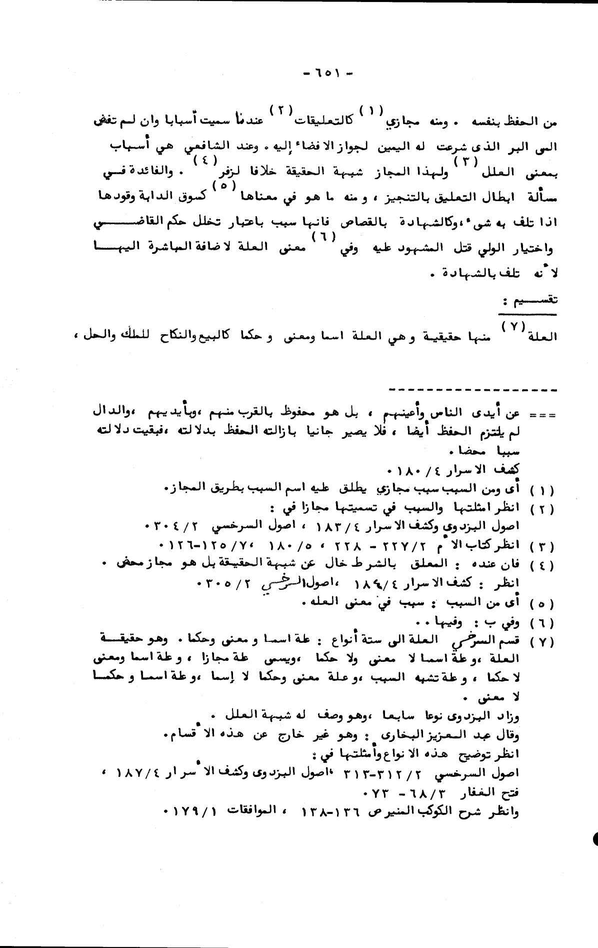 من الحفظ بنفسه. ومنه مجازي كالتعليقات عندنا سميت أسبابا وإن لم تفض إلى البر الذي شرعت له اليمين لجواز الإفضاء إليه. وعند الشافعي هي أسباب بمعنى العلل ولهذا المجاز شبهة الحقيقة خلافا لزفر. والفائدة في مسألة إبطال التعليق بالتنجيز، ومنه ما هو في معناها كسوق الدابة وقودها إذا تلف به شيء، وكالشهادة بالقصاص فإنها سبب باعتبار تخلل حكم القاضي واختيار الولي قتل المشهود عليه وفي معنى العلة لإضافة المباشرة إليها لأنه تلف بالشهادة.