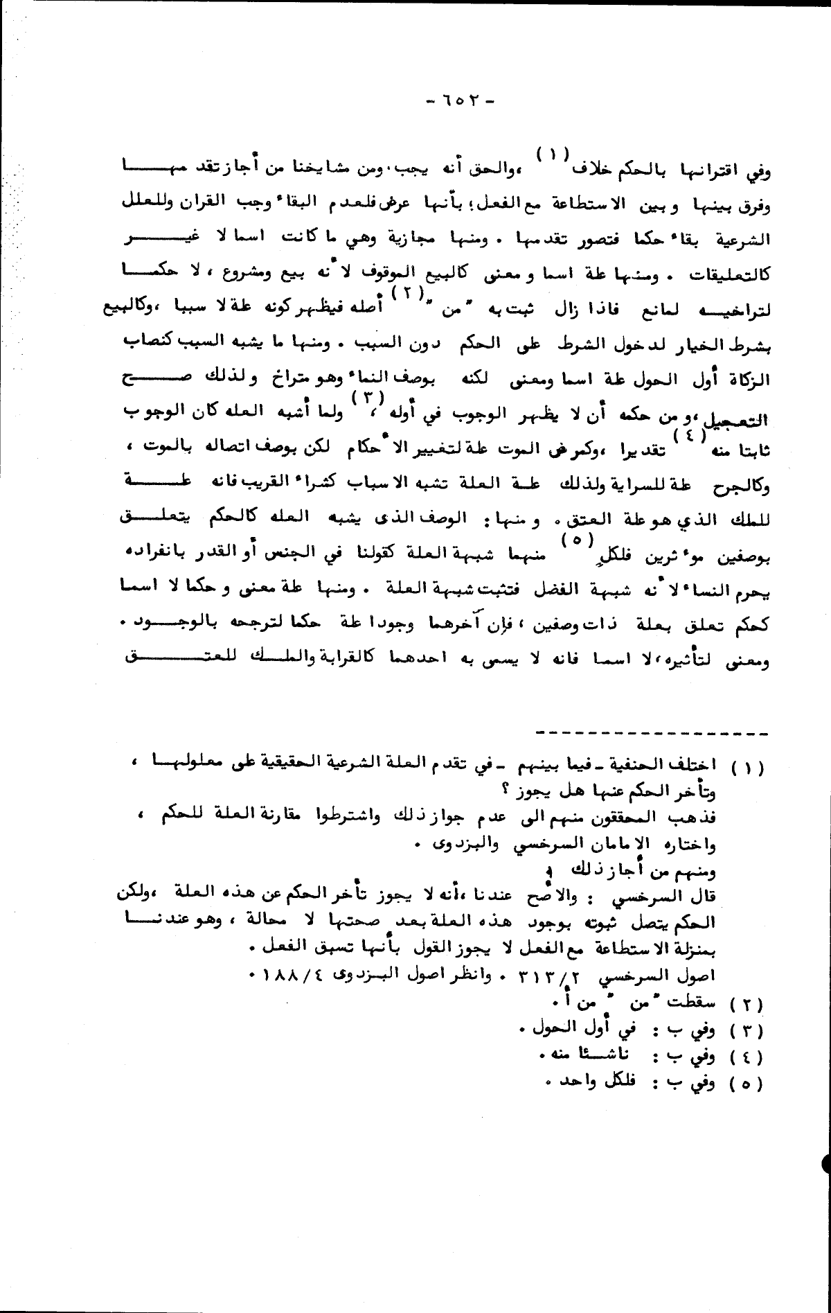 وفي اقترانها بالحكم خلاف، والحق أنه يجب. ومن مشايخنا من أجاز تقدمها وفرق بينها وبين الاستطاعة مع الفعل؛ بأنها عرض فلعدم البقاء وجب القران وللعلل الشرعية بقاء حكما فتصور تقدمها. ومنها مجازية وهي ما كانت اسما لا غير كالتعليقات. ومنها علة اسما ومعنى كالبيع الموقوف لأنه بيع ومشروع، لا حكما لتراخيه لمانع فإذا زال ثبت به "من" أصله فيظهر كونه علة لا سببا، وكالبيع بشرط الخيار لدخول الشرط على الحكم دون السبب. ومنها ما يشبه السبب كنصاب الزكاة أول الحول علة اسما ومعنى لكنه بوصف النماء وهو متراخ ولذلك صح التعجيل، ومن حكمه أن لا يظهر الوجوب في أوله، ولما أشبه العلة كان الوجوب ثابتا منه تقديرا، وكمرض الموت علة لتغيير الأحكام لكن بوصف اتصاله بالموت، وكالجرح علة للسراية ولذلك علة العلة تشبه الأسباب كشراء القريب فإنه علة للملك الذي هو علة العتق. ومنها: الوصف الذي يشبه العلة كالحكم يتعلق بوصفين مؤثرين فلكل منهما شبهة العلة كقولنا في الجنس أو القدر بانفراده يحرم النساء لأنه شبهة الفضل فثبتت شبهة العلة. ومنها علة معنى وحكما لا اسما كحكم تعلق بعلة ذات وصفين، فإن آخرهما وجودا علة حكما لترجحه بالوجود. ومعنى لتأثيره لا اسما فإنه لا يسمى به أحدهما كالقرابة والملك للعتق