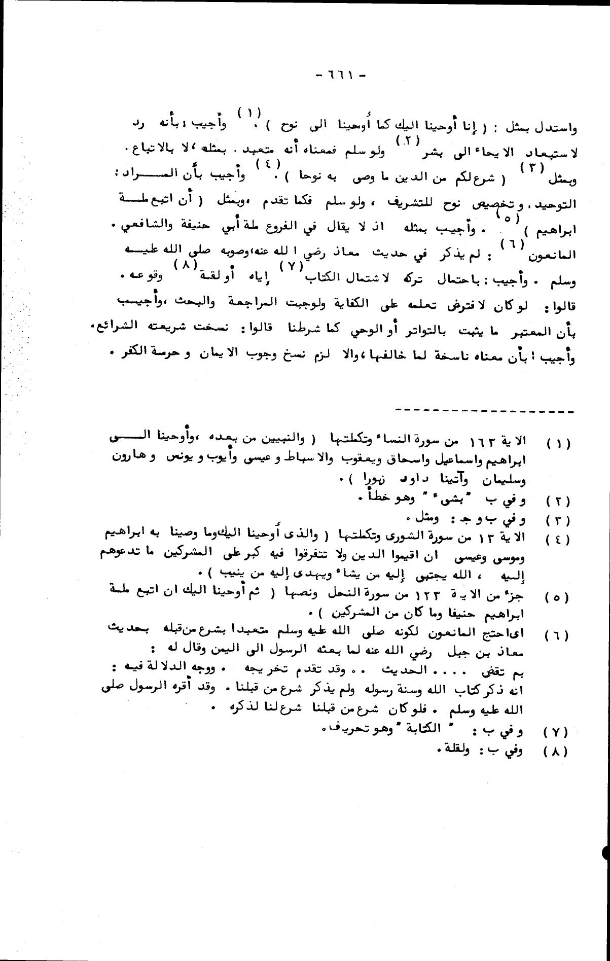 واستدل بمثل: {إنا أوحينا إليك كما أوحينا إلى نوح}. وأجيب: بأنه رد لاستبعاد الإيحاء إلى بشر، ولو سلم فمعناه أنه متعبد بمثله، لا بالاتباع. وبمثل {شرع لكم من الدين ما وصى به نوحا}. وأجيب بأن المراد التوحيد. وتخصيص نوح للتشريف، ولو سلم فكما تقدم، وبمثل {أن اتبع ملة إبراهيم}. وأجيب بمثله إذ لا يقال في الفروع ملة أبي حنيفة والشافعي. المانعون: لم يذكر في حديث معاذ رضي الله عنه، وصوبه صلى الله عليه وسلم. وأجيب: باحتمال تركه لاشتمال الكتاب إياه أو لقة [لقلة] وقوعه. قالوا: لو كان لافترض تعلمه على الكفاية ولوجبت المراجعة والبحث، وأجيب بأن المعتبر ما يثبت بالتواتر أو الوحي كما شرطنا. قالوا: نسخت شريعته الشرائع، وأجيب: بأن معناه ناسخة لما خالفها، وإلا لزم نسخ وجوب الإيمان وحرمة الكفر.