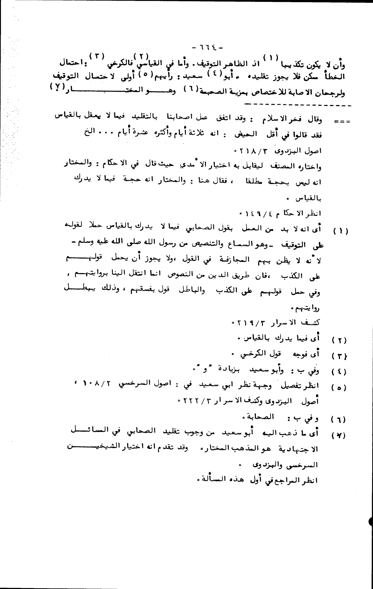 وأن لا يكون تكذيبا إذ الظاهر التوقيف. وأما في القياس فالكرخي: احتمال الخطأ ممكن فلا يجوز تقليده. أبو سعيد: رأيهم أولى لاحتمال التوقيف ولرجحان الإصابة للاختصاص بمزية الصحبة وهو المختار.