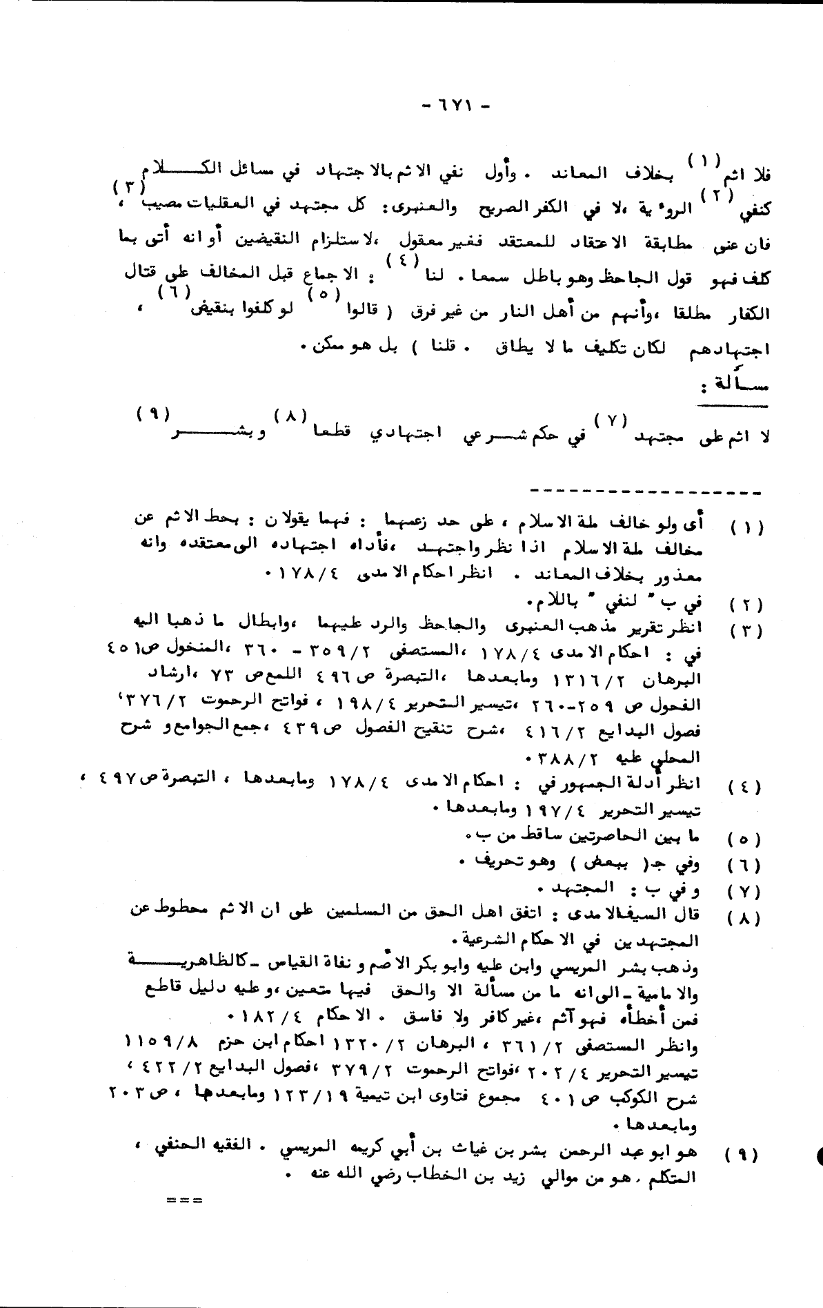 فلا إثم بخلاف المعاند. وأول نفي الإثم بالاجتهاد في مسائل الكلام كنفي الرؤية، لا في الكفر الصريح، والعنبري: كل مجتهد في العقليات مصيب، فإن عنى مطابقة الاعتقاد للمعتقد فغير معقول، لاستلزام النقيضين أو أنه أتى بما كلف فهو قول الجاحظ وهو باطل سمعا. لنا: الإجماع قبل المخالف على قتال الكفار مطلقا، وأنهم من أهل النار من غير فرق قالوا: لو كلفوا بنقيض اجتهادهم لكان تكليف ما لا يطاق. قلنا: بل هو ممكن.