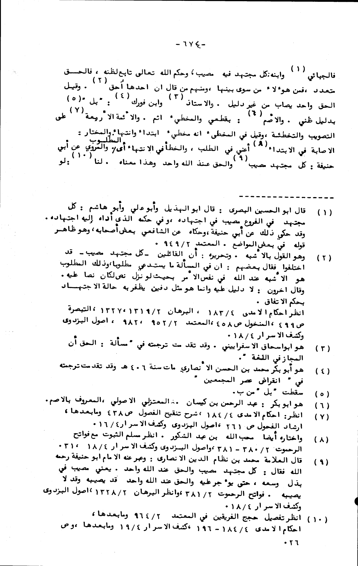 فالجبائي وابنه: كل مجتهد فيه مصيب، وحكم الله تعالى تابع لظنه، فالحق متعدد، فمن هؤلاء من سوى بينهما، ومنهم من قال إن أحدها أحق. وقيل: الحق واحد يصاب من غير دليل. والأستاذ وابن فورك: بل بدليل ظني. والأصم: بقطعي والمخطئ آثم. والأئمة الأربعة على التصويب والتخطئة، وقيل في المخطئ إنه مخطئ ابتداء وانتهاء. والمختار: الإصابة في الابتداء أعني في الطلب، والخطأ في الانتهاء أي المطلوب. والمروي عن أبي حنيفة: كل مجتهد مصيب، والحق عند الله واحد، وهذا معناه. لنا: لو