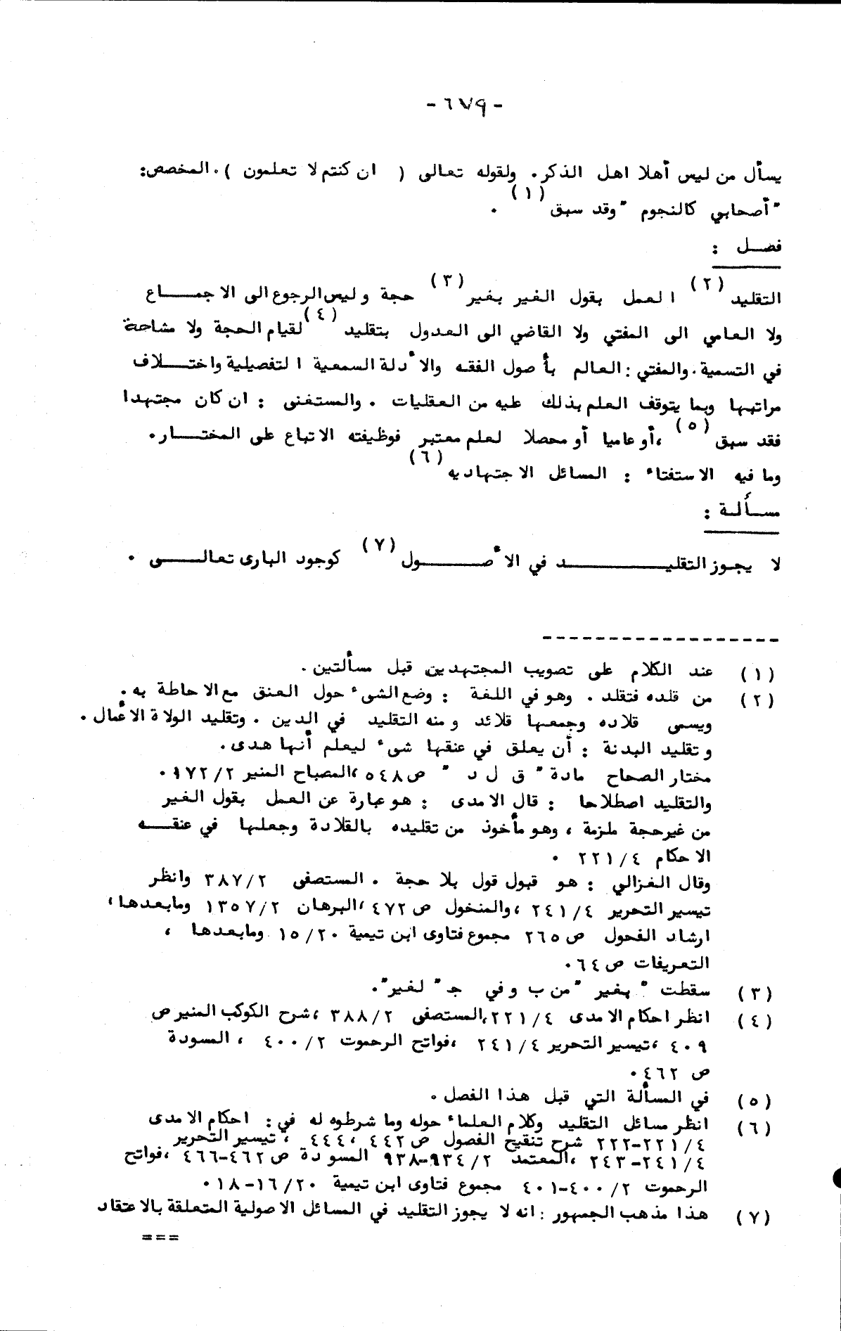التقليد العمل بقول الغير بغير حجة وليس الرجوع إلى الإجماع ولا العامي إلى المفتي ولا القاضي إلى العدول بتقليد لقيام الحجة ولا مشاحة في التسمية. والمفتي: العالم بأصول الفقه والأدلة السمعية التفصيلية واختلاف مراتبها وبما يتوقف العلم بذلك عليه من العقليات. والمستغني: إن كان مجتهدا فقد سبق، أو عاميا أو محصلا لعلم معتبر فوظيفته الاتباع على المختار. وما فيه الاستفتاء: المسائل الاجتهادية.