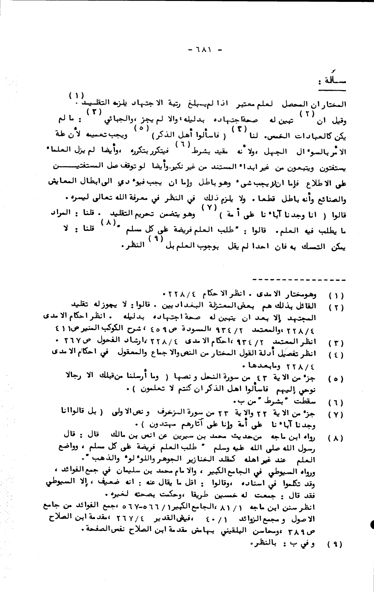 المختار أن المحصل لعلم معتبر إذا لم يبلغ رتبة الاجتهاد يلزمه التقليد. وقيل إن تبين له صحة اجتهاده بدليله، وإلا لم يجز، والجبائي: ما لم يكن كالعبادات الخمس. لنا {فاسألوا أهل الذكر} ويجب تعميمه لأن علة الأمر بالسؤال الجهل، ولأنه مقيد بشرط فيتكرر بتكرره، وأيضا لم يزل العلماء يستفتون ويتبعون من غير إبداء المستند من غير نكير. وأيضا لو توقف عمل المستفتين على الاطلاع فإما أن لا يجب شيء وهو باطل وإما أن يجب فيؤدي إلى إبطال المعايش والصنائع وأنه باطل قطعا. ولا يلزم ذلك في النظر في معرفة الله تعالى ليسره. قالوا {إنا وجدنا آباءنا على أمة} وهو يتضمن تحريم التقليد. قلنا: المراد ما يطلب فيه العلم. قالوا: "طلب العلم فريضة على كل مسلم" قلنا: لا يمكن التمسك به فإن أحدا لم يقل بوجوب العلم بل النظر.