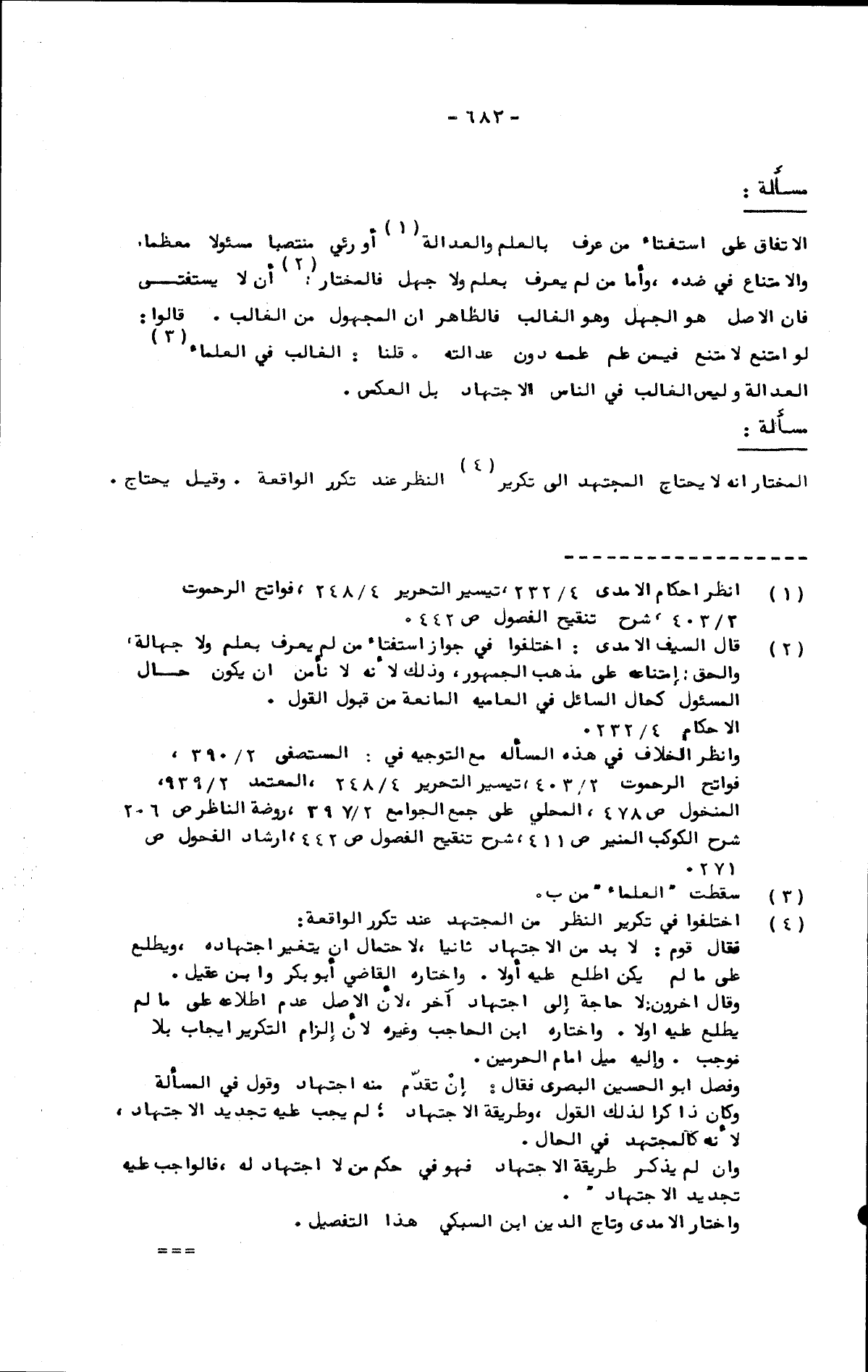 الاتفاق على استفتاء من عرف بالعلم والعدالة أو رئي منتصبا مسئولا معظما والامتناع في ضده، وأما من لم يعرف بعلم ولا جهل فالمختار: أن لا يستفتى فإن الأصل هو الجهل وهو الغالب فالظاهر أن المجهول من الغالب. قالوا: لو امتنع لامتنع فيمن علم علمه دون عدالته. قلنا: الغالب في العلماء العدالة وليس الغالب في الناس الاجتهاد بل العكس.