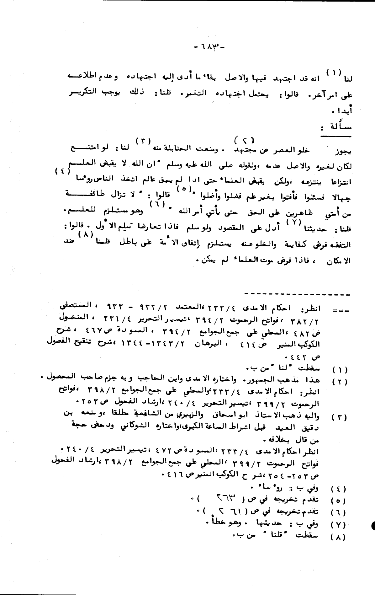 يجوز خلو العصر عن مجتهد. ومنعت الحنابلة منه لنا: لو امتنع لكان لغيره والأصل عدمه، ولقوله صلى الله الله عليه وسلم "إن الله لا يقبض العلم انتزاعا ينتزعه، ولكن يقبض العلماء حتى إذا لم يبق عالم اتخذ الناس رؤوسا جهالا فسئلوا فأفتوا بغير علم فضلوا وأضلوا" قالوا: "لا تزال طائفة من أمتي ظاهرين على الحق حتى يأتي أمر الله" وهو مستلزم للعلم. ومنعت الحنابلة منه لنا: لو امتنع لكان لغيره والأصل عدمه، ولقوله صلى الله الله عليه وسلم "إن الله لا يقبض العلم انتزاعا ينتزعه، ولكن يقبض العلماء حتى إذا لم يبق عالم اتخذ الناس رؤوسا جهالا فسئلوا فأفتوا بغير علم فضلوا وأضلوا" قالوا: "لا تزال طائفة من أمتي ظاهرين على الحق حتى يأتي أمر الله" وهو مستلزم للعلم. قلنا: حديثنا أدل على المقصود ولو سلم فإذا تعارضا سلم الأول. قالوا: التفقه فرض كفاية والخلو عنه يستلزم اتفاق الأمة على باطل قلنا عند الإمكان، فإذا فرض موت العلماء لم يمكن.