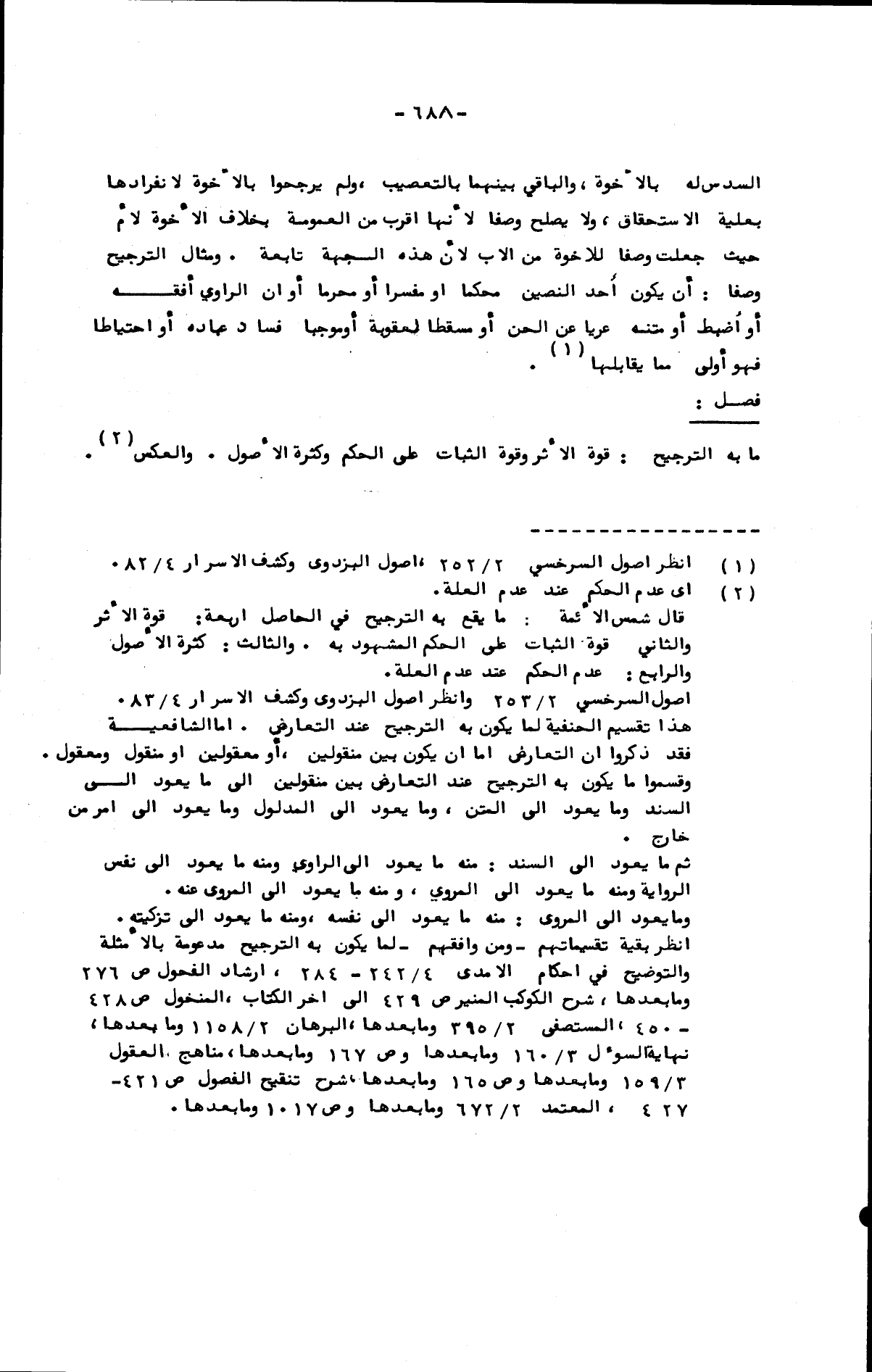 السدس له بالأخوة، والباقي بينهما بالتعصيب، ولم يرجحوا بالأخوة لانفرادها بعلية الاستحقاق، ولا يصلح وصفا لأنها أقرب من العمومة بخلاف الأخوة لأم حيث جعلت وصفا للأخوة من الأب لأن هذه الجهة تابعة. ومثال الترجيح وصفا: أن يكون أحد النصين محكما أو مفسرا أو محرما أو أن الراوي أفقه أو أضبط أو متنه عريا عن اللحن أو مسقطا لعقوبة أو موجبها فساد عبادة أو احتياطا فهو أولى مما يقابلها.