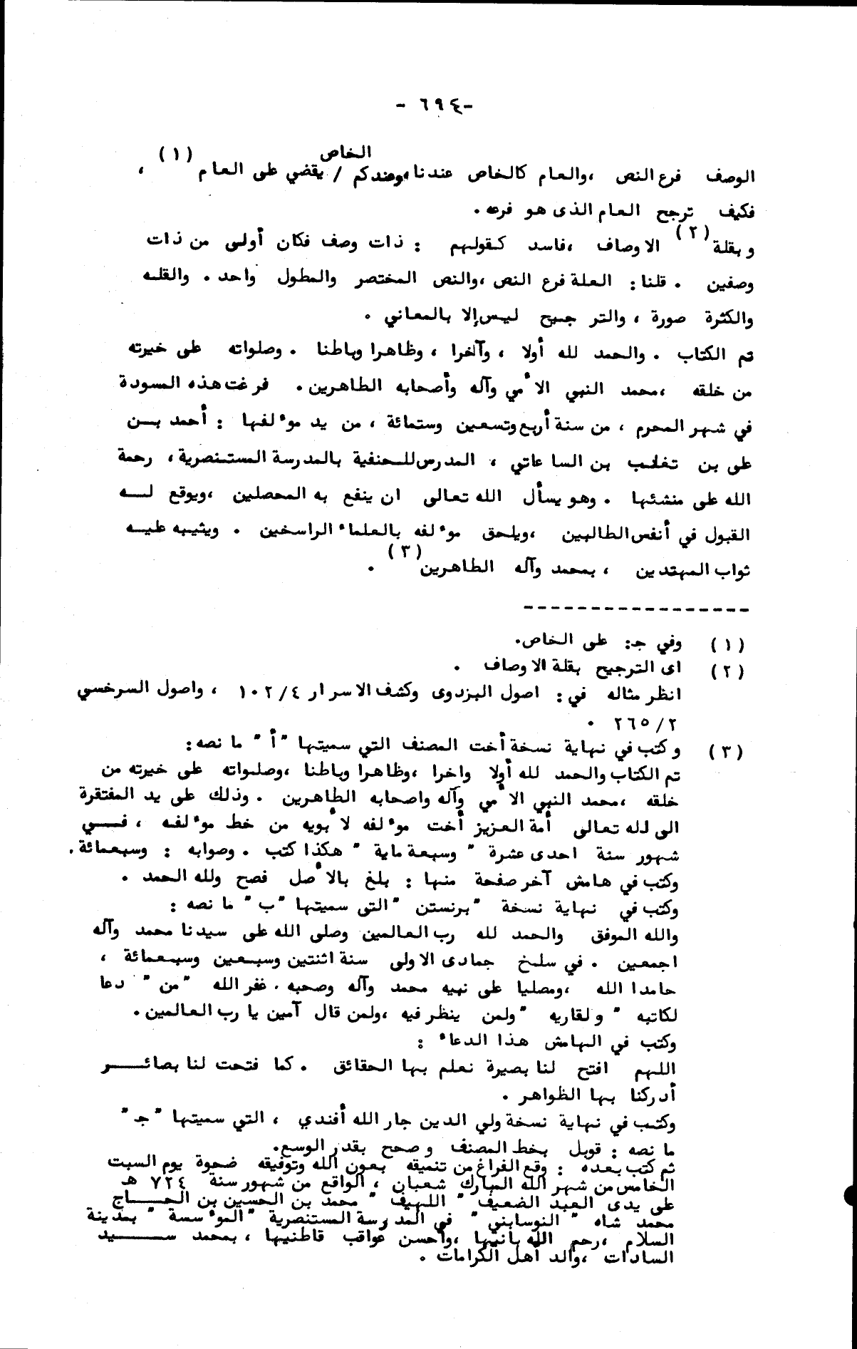 تم الكتاب. والحمد لله أولا، وآخرا، وظاهرا وباطنا. وصلواته على خيرته من خلقه، محمد النبي الأمي وآله وأصحابه الطاهرين. فرغت هذه المسودة في شهر المحرم، من سنة أربع وتسعين وستمائة، من يد مؤلفها: أحمد بن علي بن تغلب بن الساعاتي، المدرس للحنفية بالمدرسة المستنصرية، رحمة الله على منشئها. وهو يسأل الله تعالى أن ينفع به المحصلين، ويوقع له القبول في أنفس الطالبين، ويلحق مؤلفه بالعلماء الراسخين. ويثيبه عليه ثواب المهتدين، بمحمد وآله الطاهرين.