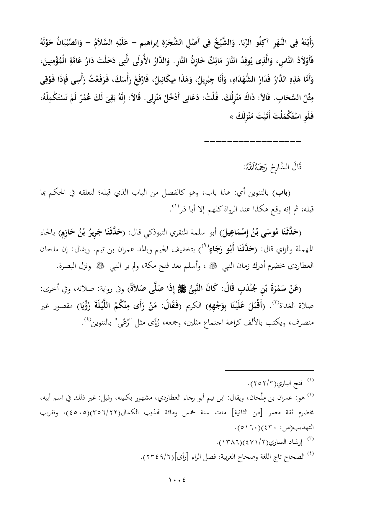 (عَنْ سَمُرَةَ بْنِ جُنْدَبٍ قَالَ: كَانَ النَّبِىُّ - صلى الله عليه وسلم - إِذَا صَلَّى صَلَاةً) وفي رواية: صلاته، وفي أخرى: صلاة الغداة (¬٣). (أَقْبَلَ عَلَيْنَا بِوَجْهِهِ) الكريم (فَقَالَ: مَنْ رَأَى مِنْكُمُ اللَّيْلَةَ رُؤْيَا) مقصور غير منصرف، ويكتب بالألف كراهة اجتماع مثلين, وجمعه، رُؤًى مثل "رُعًى" بالتنوين (¬٤).