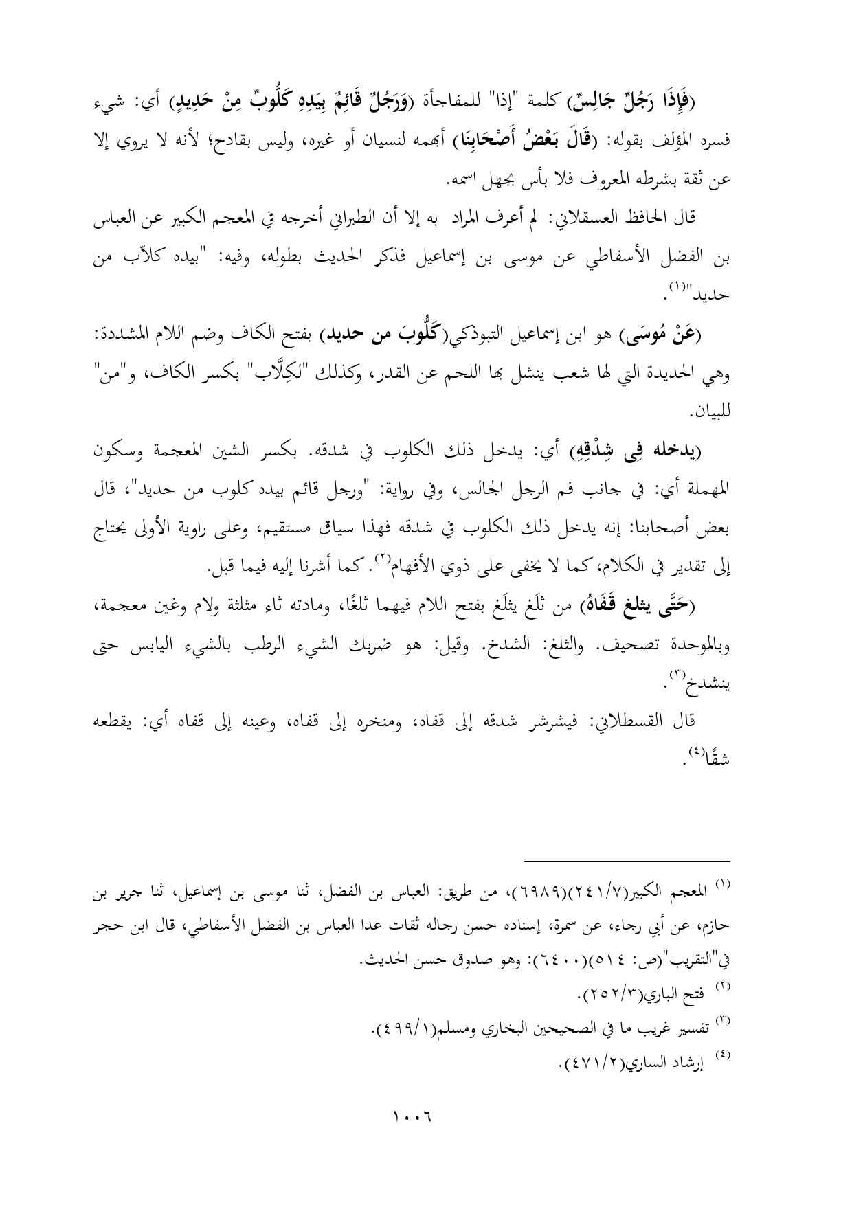 قال الحافظ العسقلاني: لم أعرف المراد به إلا أن الطبراني أخرجه في المعجم الكبير عن العباس بن الفضل الأسفاطي عن موسى بن إسماعيل فذكر الحديث بطوله, وفيه: "بيده كلاّب من حديد" (¬١).