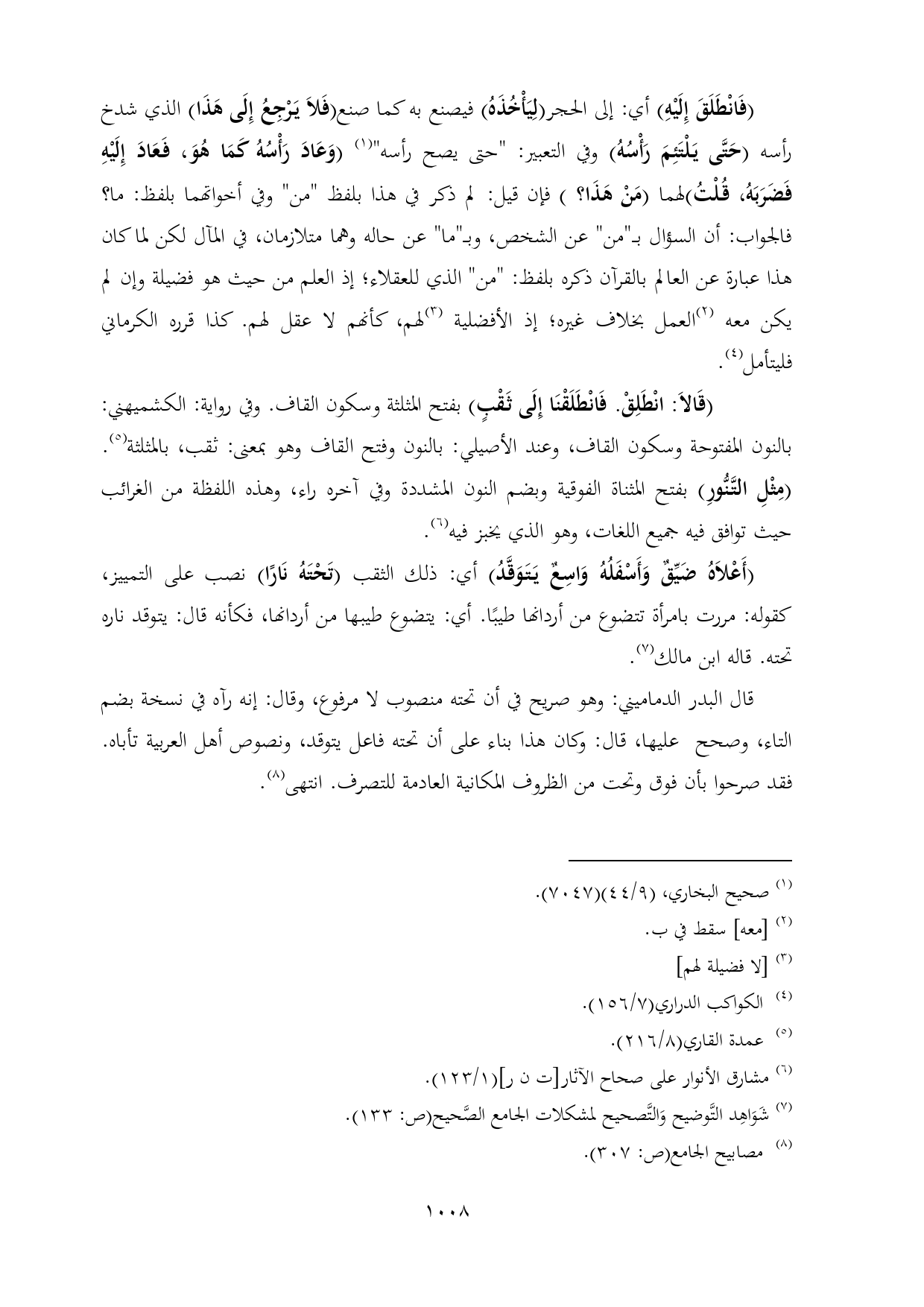(فَانْطَلَقَ إِلَيْهِ) أي: إلى الحجر (لِيَأْخُذَهُ) فيصنع به كما صنع (فَلَا يَرْجِعُ إِلَى هَذَا) الذي شدخ رأسه (حَتَّى يَلْتَئِمَ رَأْسُهُ) وفي التعبير: "حتى يصح رأسه" (¬١) (وَعَادَ رَأْسُهُ كَمَا هُوَ، فَعَادَ إِلَيْهِ فَضَرَبَهُ، قُلْتُ) لهما (مَنْ هَذَا؟) فإن قيل: لم ذكر في هذا بلفظ "من" وفي أخواتهما بلفظ: ما؟ فالجواب: أن السؤال بـ"من" عن الشخص، وبـ"ما" عن حاله وهما متلازمان، في المآل لكن لما كان هذا عبارة عن العالم بالقرآن ذكره بلفظ: "من" الذي للعقلاء؛ إذ العلم من حيث هو فضيلة وإن لم يكن معه (¬٢) العمل بخلاف غيره؛ إذ الأفضلية (¬٣) لهم، كأنهم لا عقل لهم. كذا قرره الكرماني فليتأمل (¬٤).