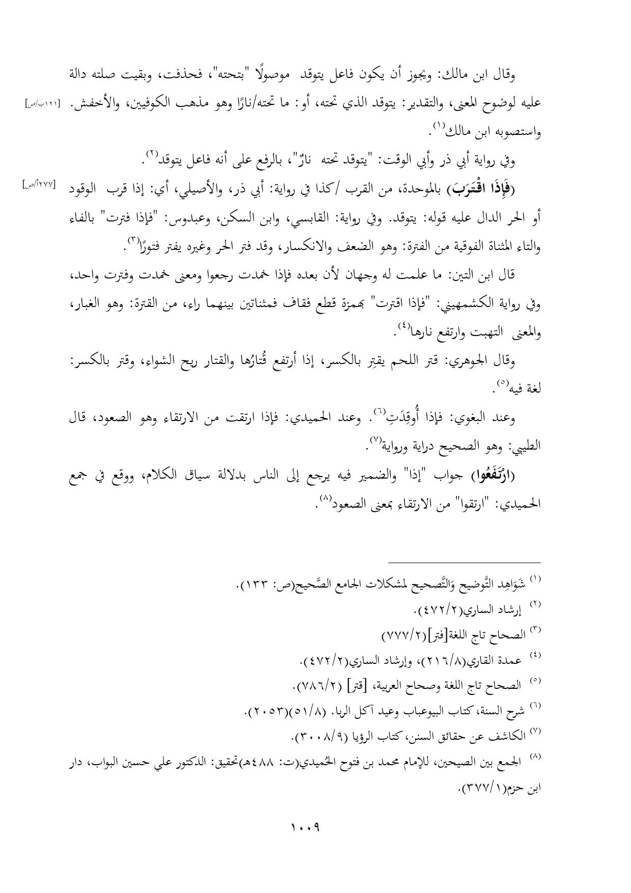 وعند البغوي: فإذا أُوقِدَتِ (¬٦). وعند الحميدي: فإذا ارتقت من الارتقاء وهو الصعود، قال الطيبي: وهو الصحيح دراية ورواية (¬٧).