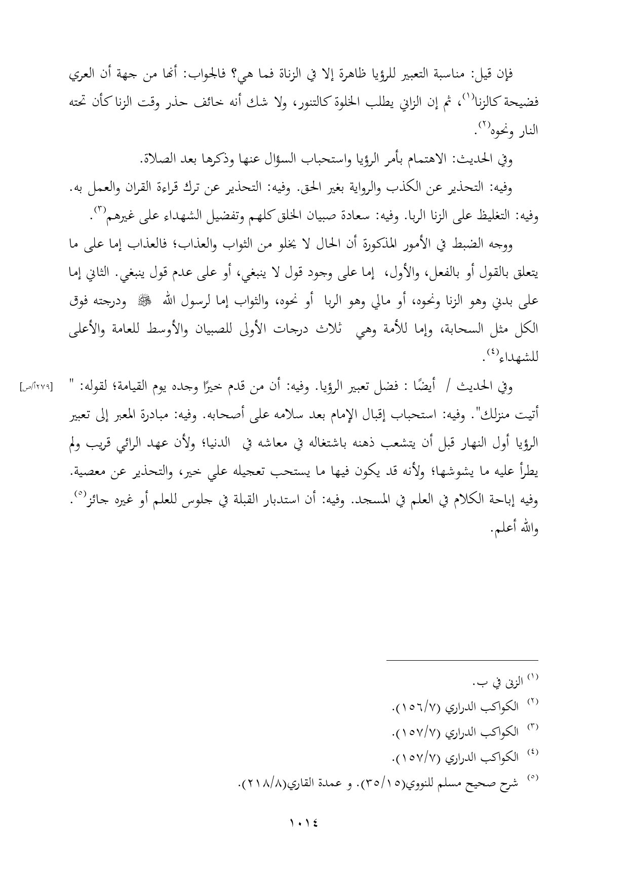 فإن قيل: مناسبة التعبير للرؤيا ظاهرة إلا في الزناة فما هي؟ فالجواب: أنها من جهة أن العري فضيحة كالزنا (¬١) , ثم إن الزاني يطلب الخلوة كالتنور, ولا شك أنه خائف حذر وقت الزنا كأن تحته النار ونحوه (¬٢).
