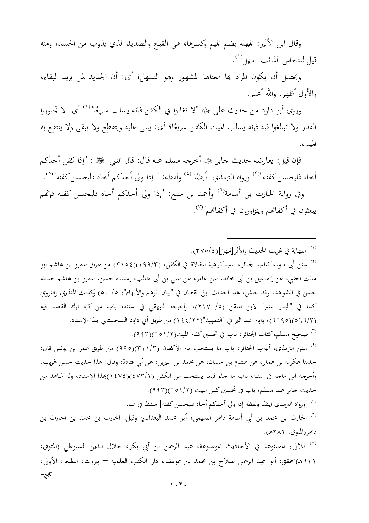 (¬٢) سنن أبي داود، كتاب الجنائز، باب كراهية المغالاة في الكفن، (٣/ ١٩٩) (٣١٥٤) من طريق عمرو بن هاشم أبو مالك الجنبي، عن إسماعيل بن أبي خالد، عن عامر، عن علي بن أبي طالب، إسناده حسن، عمرو بن هاشم حديثه حسن في الشواهد، وقد حسَّن، هذا الحديث ابنُ القطان في "بيان الوهم والأيهام" (٥/ ٥٠) وكذلك المنذري والنووي كما في "البدر المنير" لابن الملقن (٥/ ٢١٧)، وأخرجه البيهقي في سننه، باب من كره ترك القصد فيه (٣/ ٥٦٦) (٦٦٩٥)، وابن عبد البر في "التمهيد" (٢٢/ ١٤٤) من طريق أبي داود السجستاني بهذا الإسناد.