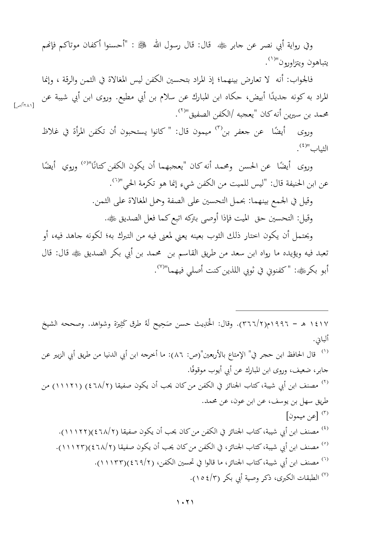 وفي رواية أبي نصر عن جابر - رضي الله عنه - قال: قال رسول الله - صلى الله عليه وسلم -: "أحسنوا أكفان موتاكم فإنهم يتباهون ويتزاورون" (¬١).