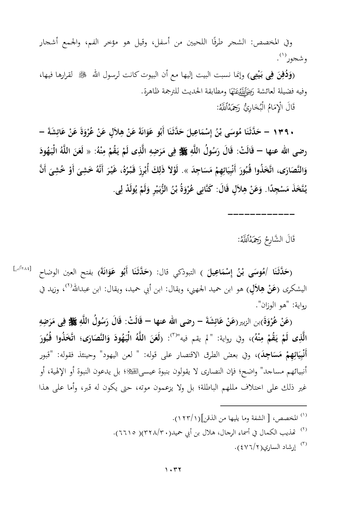 ١٣٩٠ - حَدَّثَنَا مُوسَى بْنُ إِسْمَاعِيلَ حَدَّثَنَا أَبُو عَوَانَةَ عَنْ هِلَالٍ عَنْ عُرْوَةَ عَنْ عَائِشَةَ - رضى الله عنها - قَالَتْ: قَالَ رَسُولُ اللَّهِ - صلى الله عليه وسلم - فِى مَرَضِهِ الَّذِى لَمْ يَقُمْ مِنْهُ: «لَعَنَ اللَّهُ الْيَهُودَ وَالنَّصَارَى، اتَّخَذُوا قُبُورَ أَنْبِيَائِهِمْ مَسَاجِدَ». لَوْلَا ذَلِكَ أُبْرِزَ قَبْرُهُ، غَيْرَ أَنَّهُ خَشِىَ أَوْ خُشِىَ أَنَّ يُتَّخَذَ مَسْجِدًا. وَعَنْ هِلَالٍ قَالَ: كَنَّانِى عُرْوَةُ بْنُ الزُّبَيْرِ وَلَمْ يُولَدْ لِى.