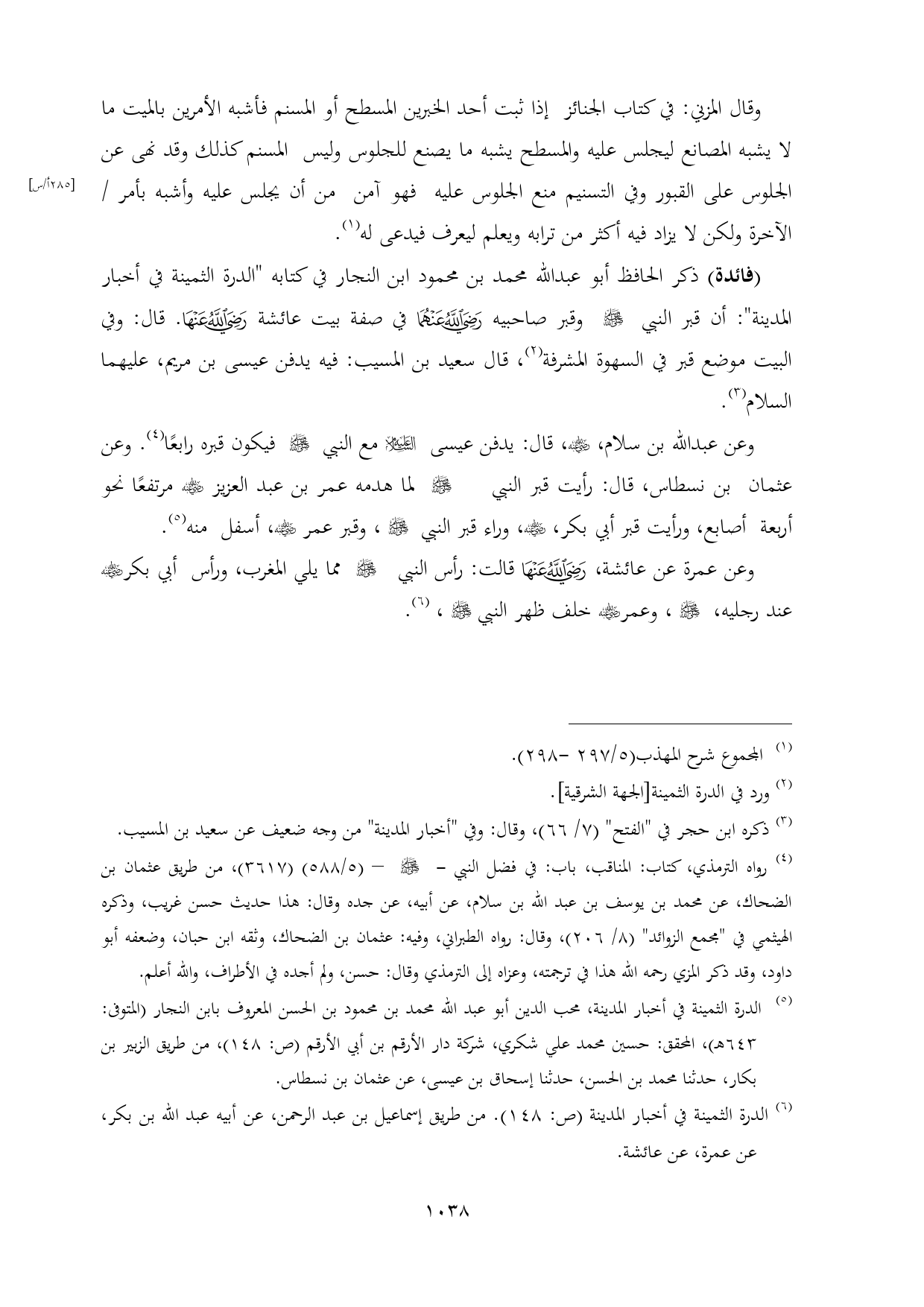 (فائدة) ذكر الحافظ أبو عبدالله محمد بن محمود ابن النجار في كتابه "الدرة الثمينة في أخبار المدينة": أن قبر النبي - صلى الله عليه وسلم - وقبر صاحبيه - رضي الله عنهما - في صفة بيت عائشة - رضي الله عنها -. قال: وفي البيت موضع قبر في السهوة المشرفة (¬٢)، قال سعيد بن المسيب: فيه يدفن عيسى بن مريم، عليهما السلام (¬٣).